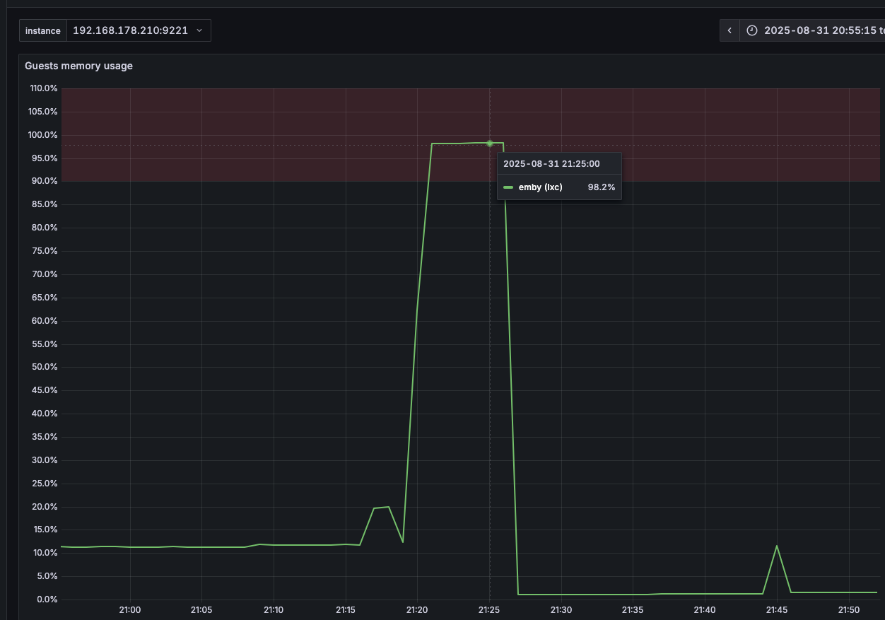 iGod42 0 Posted September 1, 2025 Posted September 1, 2025 Hi Guys, yesterday while watching some shows, when my stream died. Looking at the Server I saw that RAM is pinned close to 100%. As a temporary fix, I've added more RAM to the container which fixed the issue, and allowed me to restart my stream, however I don't really see what may have caused this, could you help me figure this out. System: Ubuntu LXC hosted in Proxmox 8.4.12 installed using (https://community-scripts.github.io/ProxmoxVE/scripts?id=emby) 4GB ram 2 VCPUs and and A380. Logs are attached (removed some stuff, to reduce size). Also here's the ram usage at the time the issue occured. Thanks! embyserver-63892281600.txt