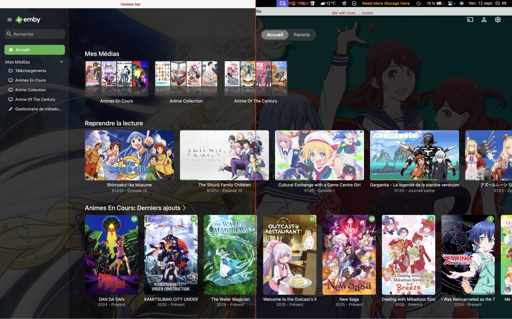 DaWNLoaD_NuLL 0 Posted September 6, 2025 Posted September 6, 2025 Hi, I don't know if it has already been discussed, but there is a line above the Emby app for Mac OS which seems useless. The design of the application interface is quite good, but with this line, it is too disturbing. I don't remember that this is the case for Plex and Jellyfin. It will be good if it can be removed in a future updated