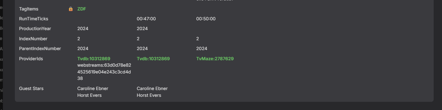 softworkz 5066 Posted October 20, 2025 Posted October 20, 2025 On 10/18/2025 at 10:42 AM, horstepipe said: But I don't see a way to move the episodes from "The Purge" to "PUR+" You might want to install the Data Explorer plugin Besides data from remote providers, it also displays all the currnet data of items (the regular UI is hiding some). Specifically interesting in your case would be the ProviderIDs as well as IndexNumber and ParentIndexNumber. Seeing these might give us some more clue.. 1