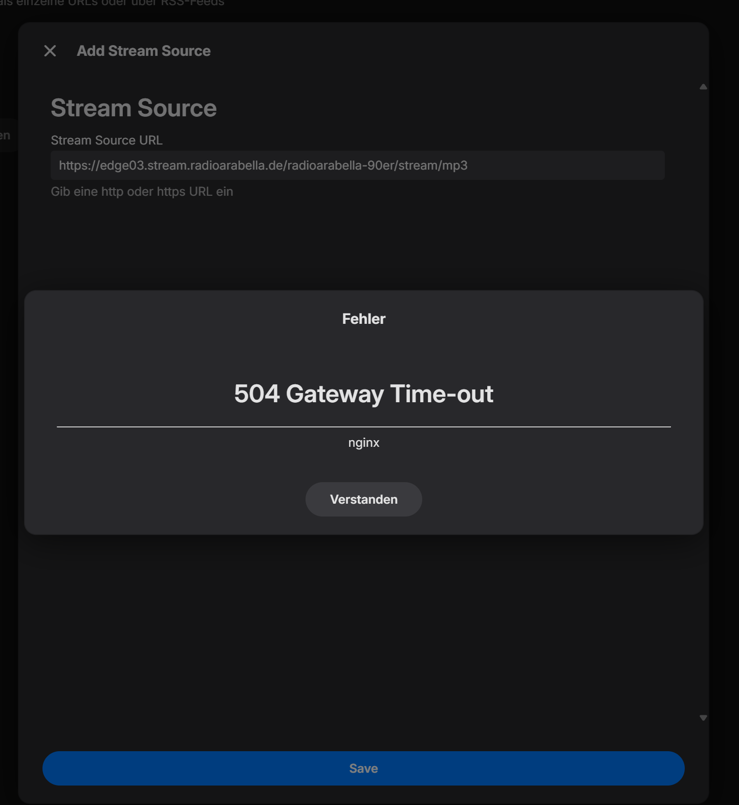 hispeed 9 Posted November 23, 2025 Posted November 23, 2025 (edited) Ok now i got it. So i add: https://edge03.stream.radioarabella.de/radioarabella-90er/stream/mp3 with the function "Quick add Source". I recieve this after a moment: Yes I have an nginx reverse proxy in front of emby. I think this the log you want: 2025-11-23 09:39:09.302 Info ServerConfigurationManager: Saving system configuration 2025-11-23 09:39:09.302 Debug XmlSerializer: Serializing to file /config/config/system.xml 2025-11-23 09:39:09.304 Info App: Setting default culture to de 2025-11-23 09:39:09.304 Info ConfigurationService-0HNHAEETPIMS3:00000001: http/1.1 Response 204 to host2. Time: 4ms. POST http://host1/emby/System/Configuration?X-Emby-Client=Emby Web&X-Emby-Device-Name=Google Chrome Windows&X-Emby-Device-Id=26e3dc6d-460e-4b4a-8e5d-9dead9473ca4&X-Emby-Client-Version=4.9.1.90&X-Emby-Token=x_secret2_x&X-Emby-Language=de&reqformat=json. 204 error?!? It think there is the problem... I had to do a second attempt to catch this log from nginx, just if you ask yourself because of the time difference. NGINX Log: IP who started the action: 192.168.XXX.XXX - - [23/Nov/2025:10:43:09 +0100] "POST /emby/UI/Command?X-Emby-Client=Emby+Web&X-Emby-Device-Name=Google+Chrome+Windows&X-Emby-Device-Id=26e3dc6d-460e-4b4a-8e5d-9dead9473ca4&X-Emby-Client-Version=4.9.1.90&X-Emby-Token=20cf6520e302402381f5c7ed11513dd8&X-Emby-Language=de&reqformat=json HTTP/2.0" 504 562 "https://emby.XXXX.XXX/web/index.html" "Mozilla/5.0 (Windows NT 10.0; Win64; x64) AppleWebKit/537.36 (KHTML, like Gecko) Chrome/142.0.0.0 Safari/537.36" NGINX config Proxy Pass rules: proxy_pass http://192.168.XX.XX:8096; proxy_set_header Host $host; proxy_set_header X-Real-IP $remote_addr; proxy_set_header X-Forwarded-For $proxy_add_x_forwarded_for; proxy_set_header X-Forwarded-Proto $scheme; # Für Websockets proxy_http_version 1.1; proxy_set_header Upgrade $http_upgrade; proxy_set_header Connection "upgrade"; Edited November 23, 2025 by hispeed
