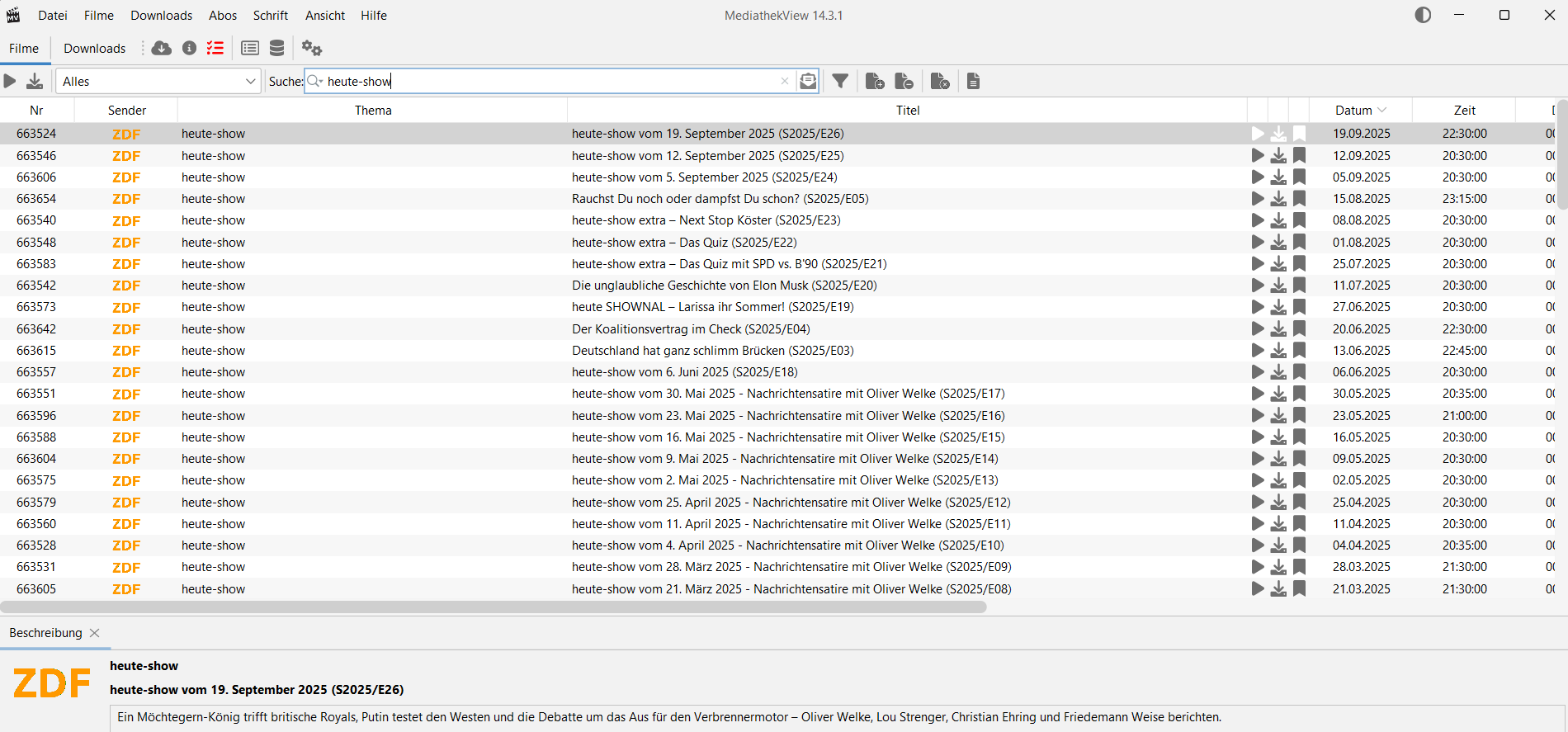 horstepipe 422 Posted September 20, 2025 Posted September 20, 2025 Any idea why I don't see heute-show in https://streamfeeds.github.io/web/m3u/de-deu-zdf-tvshows-local-mv.m3u8 this is from m3u: Quote #EXTINF:-1 group-title="heute-show" tvg-id="1700724178" tvg-name="Was ist Trumps nächster verrückter Move? Und was haben wir von der kleinsten Groko aller Zeiten zu erwarten? Oliver Welke beschäftigt sich mit den Fragen der Zeit.<br/>From 11.04.2025 20:30" tvg-country="Germany" tvg-language="German" channel-id="ZDF",heute-show vom 11. April 2025 - Nachrichtensatire mit Oliver Welke (S2025/E11) (11.04.2025) https://nrodlzdf-a.akamaihd.net/none/zdf/25/04/250411_sendung_hsh/5/250411_sendung_hsh_6660k_p37v17.mp4 #EXTINF:-1 group-title="heute-show" tvg-id="695005319" tvg-name="Oliver Welke berichtet über das neue Dream-Team der Union‚ Joe Bidens kurzen Abschiedsbesuch in Berlin‚ die bröckelnde Westbindung Europas und das Luxusgut Mietwohnung.<br/>From 18.10.2024 20:30" tvg-country="Germany" tvg-language="German" channel-id="ZDF",heute-show vom 18. Oktober 2024 - Nachrichtensatire mit Oliver Welke (S2024/E25) (18.10.2024) https://nrodlzdf-a.akamaihd.net/none/zdf/24/10/241018_sendung_hsh/1/241018_sendung_hsh_6660k_p37v17.mp4 #EXTINF:-1 group-title="heute-show" tvg-id="1831861006" tvg-name="Oliver Welke berichtet über den Zustand der Union nach Tabubruch und Nominierungsparteitag‚ über Segen und Fluch von KI und über den Handelskriegstreiber Donald Trump.<br/>From 07.02.2025 21:30" tvg-country="Germany" tvg-language="German" channel-id="ZDF",heute-show vom 7. Februar 2025 - Nachrichtensatire mit Oliver Welke (S2025/E02) (07.02.2025) my settings: I can find it in mediathekview without problems, too: