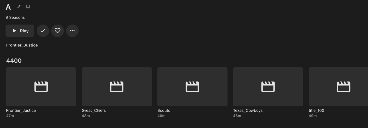 AlanBatie 5 Posted September 14, 2025 Author Posted September 14, 2025 (edited) I showed the directories in the original post, but here's the full list of files in the A directory: A/Adventures_of_the_Old_West A/Adventures_of_the_Old_West/Scouts A/Adventures_of_the_Old_West/Scouts/title_t00.mkv A/Adventures_of_the_Old_West/Great_Chiefs A/Adventures_of_the_Old_West/Great_Chiefs/title_t00.mkv A/Adventures_of_the_Old_West/Texas_Cowboys A/Adventures_of_the_Old_West/Texas_Cowboys/title_t00.mkv A/Adventures_of_the_Old_West/49ers A/Adventures_of_the_Old_West/49ers/title_t00.mkv A/Adventures_of_the_Old_West/49ers/title_t01.mkv A/Adventures_of_the_Old_West/Frontier_Justice A/Adventures_of_the_Old_West/Frontier_Justice/title_t00.mkv A/Alias_Smith_and_Jones A/Alias_Smith_and_Jones/Alias_Smith_and_Jones-S01 A/Alias_Smith_and_Jones/Alias_Smith_and_Jones-S01/Alias_Smith_and_Jones-S01E01.mkv A/Alias_Smith_and_Jones/Alias_Smith_and_Jones-S01/Alias_Smith_and_Jones-S01E02.mkv A/Alias_Smith_and_Jones/Alias_Smith_and_Jones-S01/Alias_Smith_and_Jones-S01E03.mkv A/Alias_Smith_and_Jones/Alias_Smith_and_Jones-S01/Extras A/Alias_Smith_and_Jones/Alias_Smith_and_Jones-S01/Extras/title_t04.mkv A/Alias_Smith_and_Jones/Alias_Smith_and_Jones-S01/Extras/title_t05.mkv A/Alias_Smith_and_Jones/Alias_Smith_and_Jones-S01/Alias_Smith_and_Jones-S01E12.mkv A/Alias_Smith_and_Jones/Alias_Smith_and_Jones-S01/Alias_Smith_and_Jones-S01E13.mkv A/Alias_Smith_and_Jones/Alias_Smith_and_Jones-S01/Alias_Smith_and_Jones-S01E14.mkv A/Alias_Smith_and_Jones/Alias_Smith_and_Jones-S01/Alias_Smith_and_Jones-S01E15.mkv A/Alias_Smith_and_Jones/Alias_Smith_and_Jones-S01/Alias_Smith_and_Jones-S01E08.mkv A/Alias_Smith_and_Jones/Alias_Smith_and_Jones-S01/Alias_Smith_and_Jones-S01E09.mkv A/Alias_Smith_and_Jones/Alias_Smith_and_Jones-S01/Alias_Smith_and_Jones-S01E10.mkv A/Alias_Smith_and_Jones/Alias_Smith_and_Jones-S01/Alias_Smith_and_Jones-S01E11.mkv A/Alias_Smith_and_Jones/Alias_Smith_and_Jones-S01/Alias_Smith_and_Jones-S01E04.mkv A/Alias_Smith_and_Jones/Alias_Smith_and_Jones-S01/Alias_Smith_and_Jones-S01E05.mkv A/Alias_Smith_and_Jones/Alias_Smith_and_Jones-S01/Alias_Smith_and_Jones-S01E06.mkv A/Alias_Smith_and_Jones/Alias_Smith_and_Jones-S01/Alias_Smith_and_Jones-S01E07.mkv A/Alien_Nation A/Alien_Nation/Alien_Nation-S01 A/Alien_Nation/Alien_Nation-S01/Alien_Nation-S01E01.mkv A/Alien_Nation/Alien_Nation-S01/Alien_Nation-S01E20.mkv A/Alien_Nation/Alien_Nation-S01/Alien_Nation-S01E21.mkv A/Alien_Nation/Alien_Nation-S01/Alien_Nation-S01E22.mkv A/Alien_Nation/Alien_Nation-S01/Alien_Nation-S01E18.mkv A/Alien_Nation/Alien_Nation-S01/Alien_Nation-S01E19.mkv A/Alien_Nation/Alien_Nation-S01/Alien_Nation-S01E16.mkv A/Alien_Nation/Alien_Nation-S01/Alien_Nation-S01E17.mkv A/Alien_Nation/Alien_Nation-S01/Alien_Nation-S01E14.mkv A/Alien_Nation/Alien_Nation-S01/Alien_Nation-S01E15.mkv A/Alien_Nation/Alien_Nation-S01/Alien_Nation-S01E12.mkv A/Alien_Nation/Alien_Nation-S01/Alien_Nation-S01E13.mkv A/Alien_Nation/Alien_Nation-S01/Alien_Nation-S01E10.mkv A/Alien_Nation/Alien_Nation-S01/Alien_Nation-S01E11.mkv A/Alien_Nation/Alien_Nation-S01/Alien_Nation-S01E08.mkv A/Alien_Nation/Alien_Nation-S01/Alien_Nation-S01E09.mkv A/Alien_Nation/Alien_Nation-S01/Alien_Nation-S01E06.mkv A/Alien_Nation/Alien_Nation-S01/Alien_Nation-S01E07.mkv A/Alien_Nation/Alien_Nation-S01/Alien_Nation-S01E04.mkv A/Alien_Nation/Alien_Nation-S01/Alien_Nation-S01E05.mkv A/Alien_Nation/Alien_Nation-S01/Alien_Nation-S01E02.mkv A/Alien_Nation/Alien_Nation-S01/Alien_Nation-S01E03.mkv A/Alien_Nation/Specials A/Alien_Nation/Specials/Alien_Nation-S00E01-Dark_Horizon.mkv A/Alien_Nation/Specials/Alien_Nation-S00E02-Body_and_Soul.mkv A/Alien_Nation/Specials/Alien_Nation-S00E03-Millenium.mkv A/Alien_Nation/Specials/Alien_Nation-S00E04-Enemy_Within.mkv A/Alien_Nation/Specials/Alien_Nation-S00E05-Udara_Legacy.mkv A/Alien_Nation/Extras A/Alien_Nation/Extras/ALIEN NATION DARK HORIZON_t01.mkv A/Alien_Nation/Extras/ALIEN NATION DARK HORIZON_t02.mkv A/Alien_Nation/Extras/S00E02-title_t01.mkv A/Alien_Nation/Extras/S00E02-title_t02.mkv A/Alien_Nation/Extras/S00E03-title_t01.mkv A/Alien_Nation/Extras/S00E03-title_t02.mkv A/Alien_Nation/Extras/S00E04-title_t01.mkv A/Alien_Nation/Extras/S00E05-title_t01.mkv A/Alien_Nation/Extras/title_t01.mkv A/Almost_Human A/Almost_Human/Almost_Human-S01 A/Almost_Human/Almost_Human-S01/Almost_Human-S01E01.mkv A/Almost_Human/Almost_Human-S01/Almost_Human-S01E02.mkv A/Almost_Human/Almost_Human-S01/Almost_Human-S01E03.mkv A/Almost_Human/Almost_Human-S01/Almost_Human-S01E04.mkv A/Almost_Human/Almost_Human-S01/Almost_Human-S01E05.mkv A/Almost_Human/Almost_Human-S01/Almost_Human-S01E06.mkv A/Almost_Human/Almost_Human-S01/Almost_Human-S01E07.mkv A/Almost_Human/Almost_Human-S01/Almost_Human-S01E08.mkv A/Almost_Human/Almost_Human-S01/Almost_Human-S01E09.mkv A/Almost_Human/Almost_Human-S01/Almost_Human-S01E10.mkv A/Almost_Human/Almost_Human-S01/Almost_Human-S01E11.mkv A/Almost_Human/Almost_Human-S01/Almost_Human-S01E12.mkv A/Almost_Human/Almost_Human-S01/Almost_Human-S01E13.mkv A/Almost_Human/Almost_Human-S01/Extras A/Almost_Human/Almost_Human-S01/Extras/title04.mkv A/Almost_Human/Almost_Human-S01/Extras/title05.mkv A/Almost_Human/Almost_Human-S01/Extras/title06.mkv A/Andromeda A/Andromeda/Andromeda-S01 A/Andromeda/Andromeda-S01/Andromeda-S01E01.mkv A/Andromeda/Andromeda-S01/Andromeda-S01E02.mkv A/Andromeda/Andromeda-S01/Andromeda-S01E03.mkv A/Andromeda/Andromeda-S01/Extras A/Andromeda/Andromeda-S01/Extras/title_t03.mkv A/Andromeda/Andromeda-S01/Extras/title_t04.mkv A/Andromeda/Andromeda-S01/Extras/title_t05.mkv A/Andromeda/Andromeda-S01/Extras/title_t06.mkv A/Andromeda/Andromeda-S01/Extras/title_t02.mkv A/Andromeda/Andromeda-S01/Extras/title_t03 copy.mkv A/Andromeda/Andromeda-S01/Extras/title_t04 copy.mkv A/Andromeda/Andromeda-S01/Extras/title_t05 copy.mkv A/Andromeda/Andromeda-S01/Extras/title_t06 copy.mkv A/Andromeda/Andromeda-S01/Andromeda-S01E04.mkv A/Andromeda/Andromeda-S01/Andromeda-S01E05.mkv