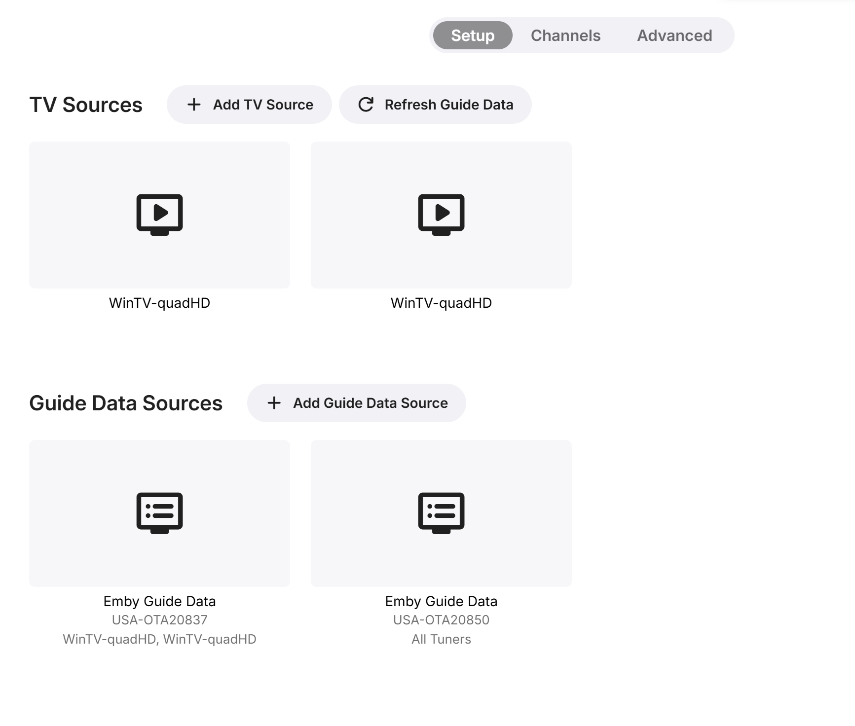 Hello, I am having trouble getting the OTA guide data to populate in Emby. As best as I can tell recordings are still working and I can manually go to a channel, but the guide is completely empty. When I look at the logs it appears as if the guide data is downloading, although it says it only took 9 seconds. I do not see any errors that seem relevant to the guide data missing. I also tried to use a different zip code in the same service area, but that did not work.  I thought maybe the guide data source is the problem. So I went to https://www.channelmaster.com/pages/free-tv-guide-listings and most of the channels are missing from this guide as well, but even those channels with have guide data are not showing in my Emby guide so I don't think that is the case. Any help would be appreciated.