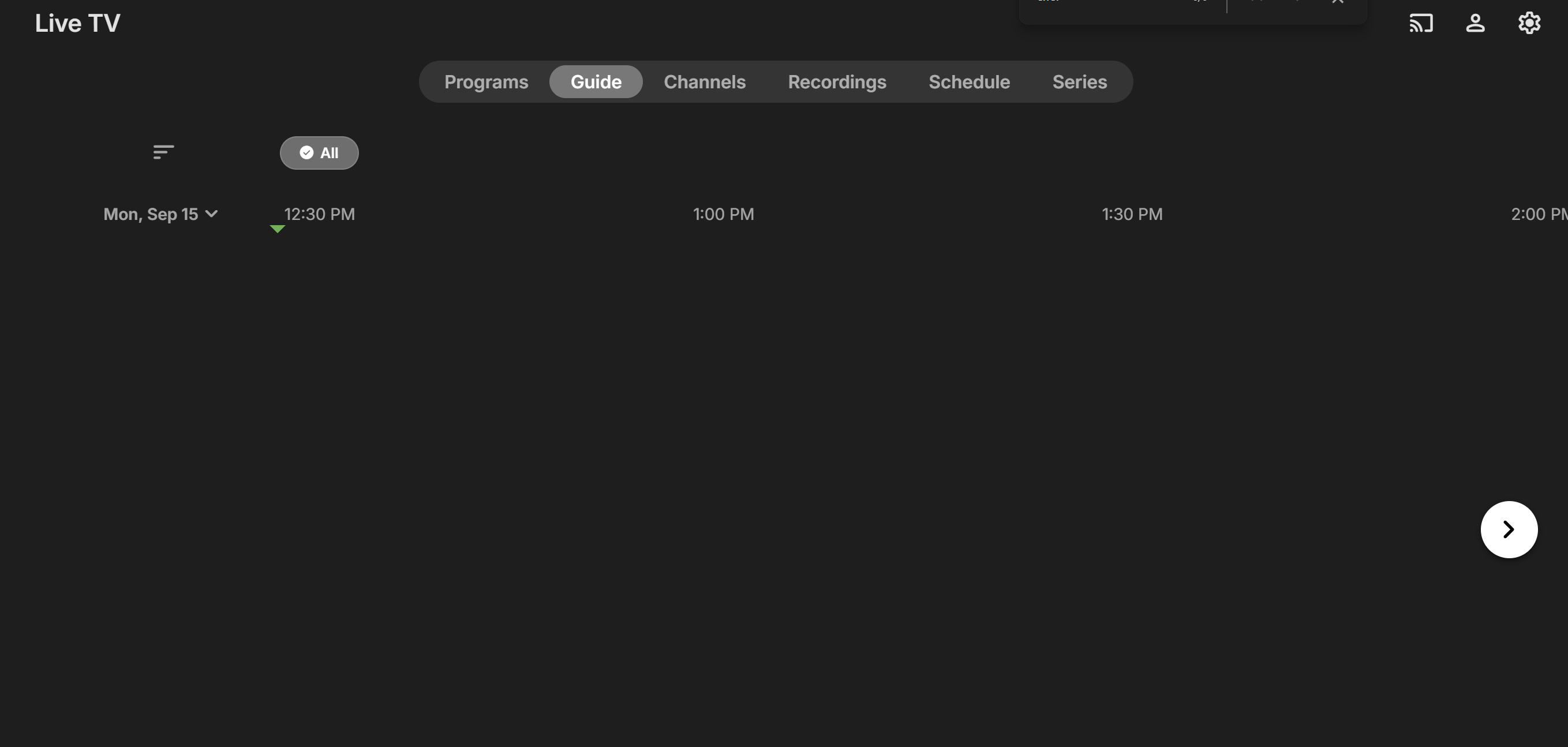 don't see any filter options when I click the icon at the top left of the guide. I think I have used the filter ever and in the screenshots you can see that "all" is highlighted. However, when I clicked "all" now the guide shows