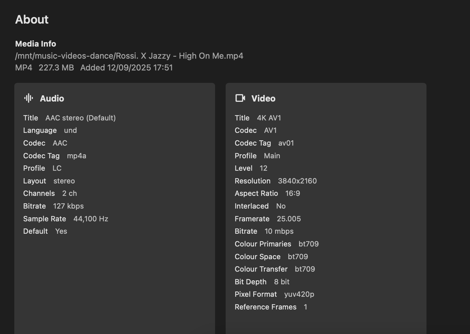 brothom 177 Posted September 26, 2025 Posted September 26, 2025 On 23/09/2025 at 20:08, xbmcgotham said: Hi @GrimReaper there is no ffmpeg log created for this particular date. I just played one of the files and checked the log for a new ffmpeg log, but there is none. No log indicates that no transcoding has occurred. On 18/09/2025 at 17:03, xbmcgotham said: Hi, I have serious issue with Emby when AV1 content is played. When playing this video content on a Mac App or Nvidea Shield Emby app it will stotter the video, audio will sometimes brake and regularly the app on the Shield will crash. The strange thing that it will run fine in the Brave browser on the Mac when opening the Emby web gui. How can this be resolved? What information would you need to assist me? Thanks for the assistants If the video stutters, but no transcoding is happening the video is probably "too heavy" for the device to handle, even if it should be able to play the codec. An easy way to reproduce stutter on Windows is by having an older laptop (2014-ish) and playing 4K (h264) videos. The browser can and will play it but most older Windows devices will just stutter beyond believe. Can you share the specifications of the file and on what device are you trying to play the AV1 file? This information can be found at the bottom in Emby on the media's detail page, for example:
