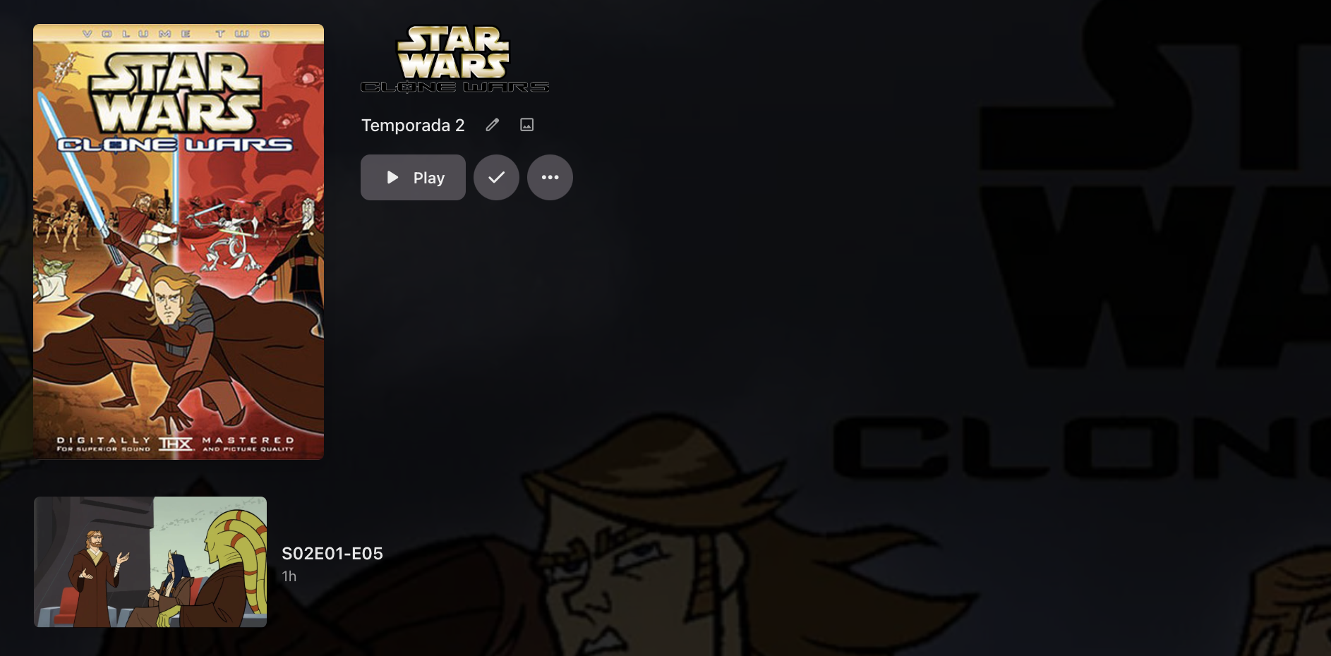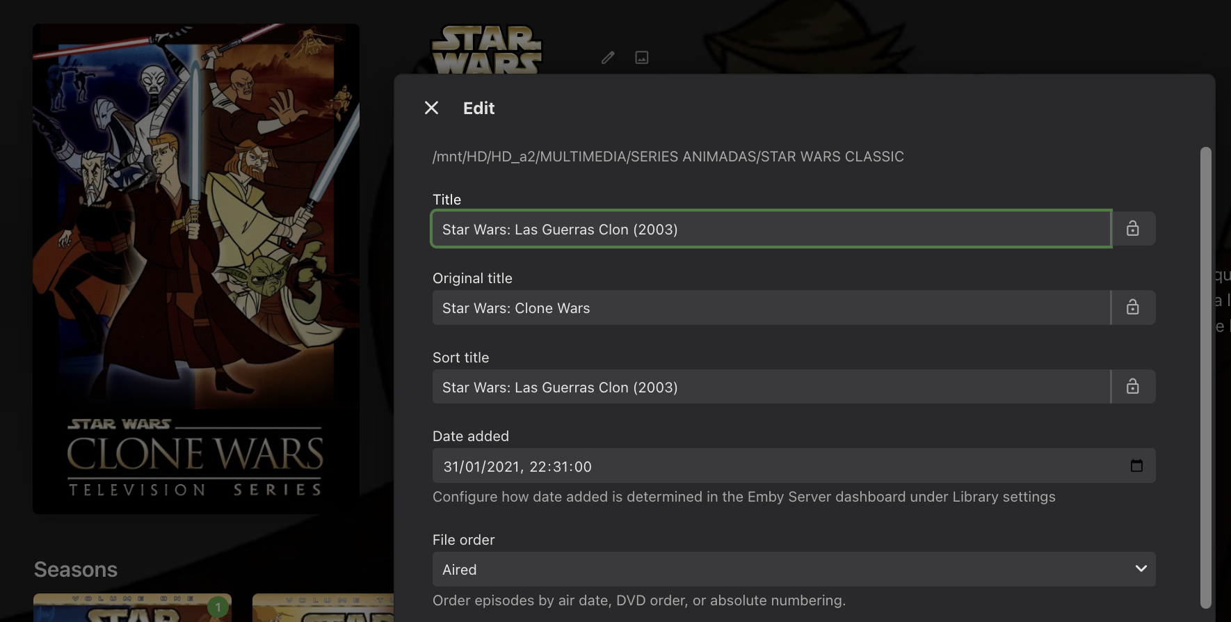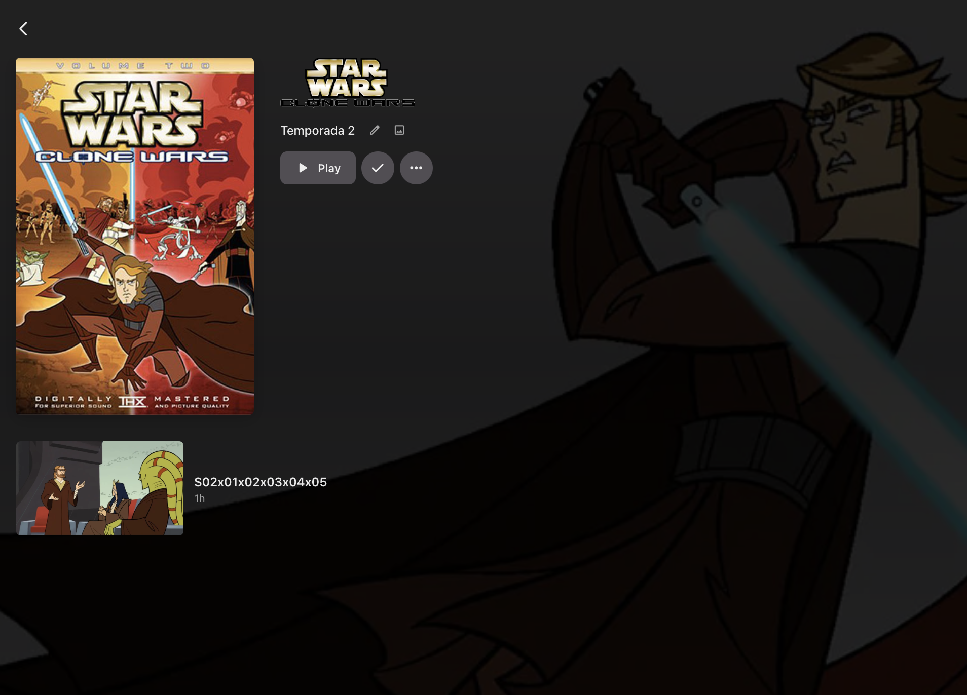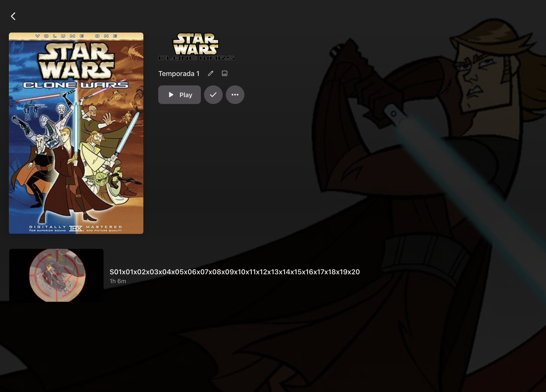 DarkStar1977 119 Posted September 19, 2025 Posted September 19, 2025 Hi, I'm trying to get in my Emby the Star Wars Clone Wars Classic (https://thetvdb.com/series/star-wars-clone-wars). This series was originally aired by Cartoon Network in 3 seasons, where season 1 where 10 episodes of 3 minutes, season 2 where 10 episodes of 3 minutes and season 3 where 5 episodes of 12-15 minutes. The only published media is the DVD one, where in DVD 1 are the 20 episodes mounted as 1 single video, and DVD 2 are 5 episodes in 1 single video, converting 3 seasons in 2. So first I've done is once the show has identified (manually identification), changed order to DVD instead of default order into show metadata: This match what I have as the Aired order was splitted into 3 seasons: Aired Order DVD Order Well my issue comes on naming the 2 videos that compone the DVD Season 1 and Season 2, I've tried: S01E01E20 / S02E01E05 S01E01E02E03E04E05E06E07E08E09E10E11E12E13E14E15E16E17E18E19E20 / S02E01E02E03E04E05 01x01 - x20 / 02x01 - x05 Plus all the other options detailed in: https://emby.media/support/articles/TV-Naming.html NOTHING is capable to download any metadata for this episodes: In addition and I don't know if this can help, the Statistics Plugin, is presenting this for this show: This makes me clear that the show is identified but the episodes are not identified. Any ideas on how to name this to be identified ? Maybe are too much episodes in one and there's a limitation in emby for that. Any help will be appreciated. Thanks in advance.