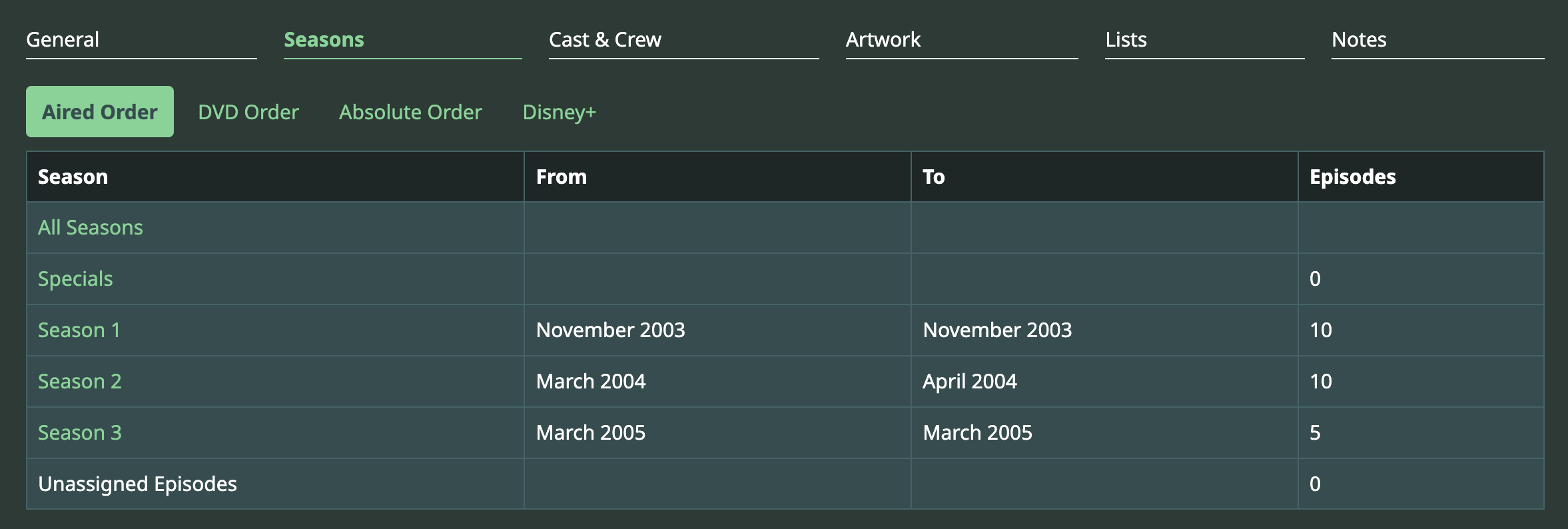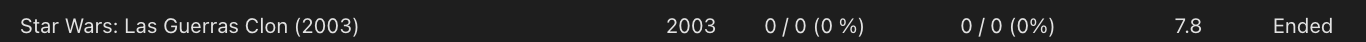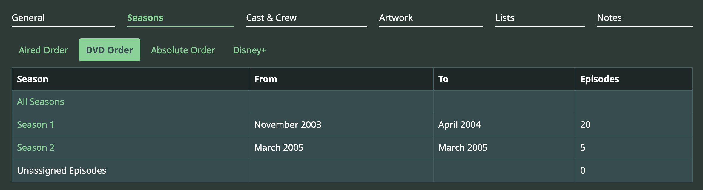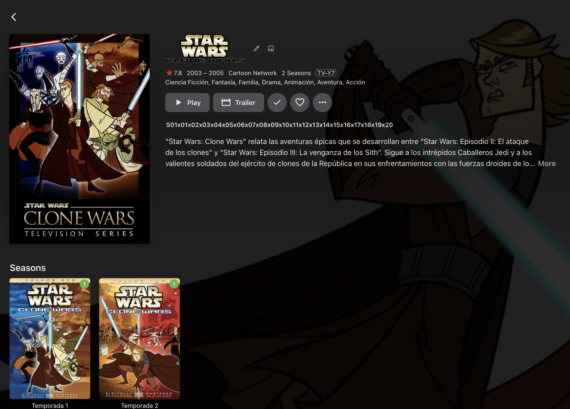 DarkStar1977 119 Posted September 19, 2025 Posted September 19, 2025 Hi, I'm trying to get in my Emby the Star Wars Clone Wars Classic (https://thetvdb.com/series/star-wars-clone-wars). This series was originally aired by Cartoon Network in 3 seasons, where season 1 where 10 episodes of 3 minutes, season 2 where 10 episodes of 3 minutes and season 3 where 5 episodes of 12-15 minutes. The only published media is the DVD one, where in DVD 1 are the 20 episodes mounted as 1 single video, and DVD 2 are 5 episodes in 1 single video, converting 3 seasons in 2. So first I've done is once the show has identified (manually identification), changed order to DVD instead of default order into show metadata: This match what I have as the Aired order was splitted into 3 seasons: Aired Order DVD Order Well my issue comes on naming the 2 videos that compone the DVD Season 1 and Season 2, I've tried: S01E01E20 / S02E01E05 S01E01E02E03E04E05E06E07E08E09E10E11E12E13E14E15E16E17E18E19E20 / S02E01E02E03E04E05 01x01 - x20 / 02x01 - x05 Plus all the other options detailed in: https://emby.media/support/articles/TV-Naming.html NOTHING is capable to download any metadata for this episodes: In addition and I don't know if this can help, the Statistics Plugin, is presenting this for this show: This makes me clear that the show is identified but the episodes are not identified. Any ideas on how to name this to be identified ? Maybe are too much episodes in one and there's a limitation in emby for that. Any help will be appreciated. Thanks in advance.