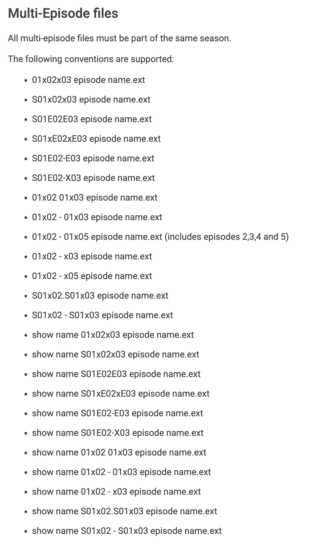 DarkStar1977 119 Posted September 20, 2025 Author Posted September 20, 2025 (edited) 2 hours ago, js28194 said: Also, multi episodes files, I have settled on a single way which is different than yours. My example is as follows which has never let me down: s01x01x02x03x04 s02x01x02x03 etc etc etc I'm not saying the other ways don't work, I just know this absolutely works. I had problems defining "ranges" a long time and just moved on. In you example, under your temporary folders, I don't see any .nfo files generated so that could be an issue. Tried your naming and it's not working in my case, I'm not using .nfo files in my libraries Edited September 20, 2025 by DarkStar1977