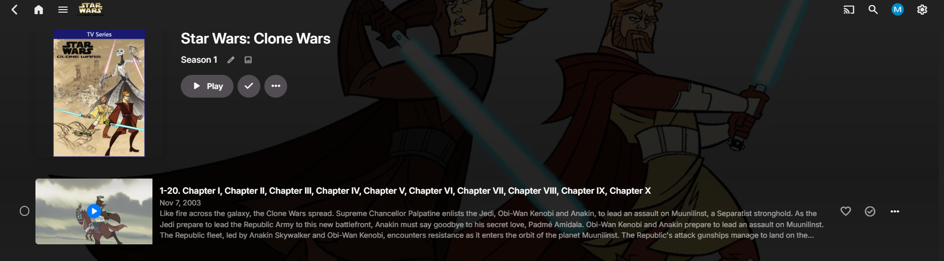 Happy2Play 9780 Posted September 20, 2025 Posted September 20, 2025 (edited) Not sure of your issue as I just added this without issue. Only issue is needing manual Identification as there is no such show (Star Wars Classic). Identified with TVDBid-72244 Aired order see the naming limited to 10 per that order Changed to DVD order and Refreshed metadata. You can see titles changes to include all 1-20 Edited September 20, 2025 by Happy2Play