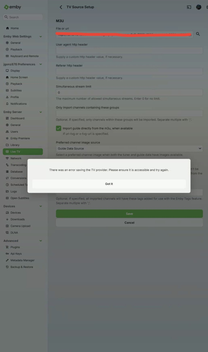 jgonz878 4 Posted September 30, 2025 Author Posted September 30, 2025 Wanted to share, I tried a different m3u url provider, and same thing. No matter what iptv url m3u I may use, it is still giving same error. I attached a new server log for you to see. embyserver.txt