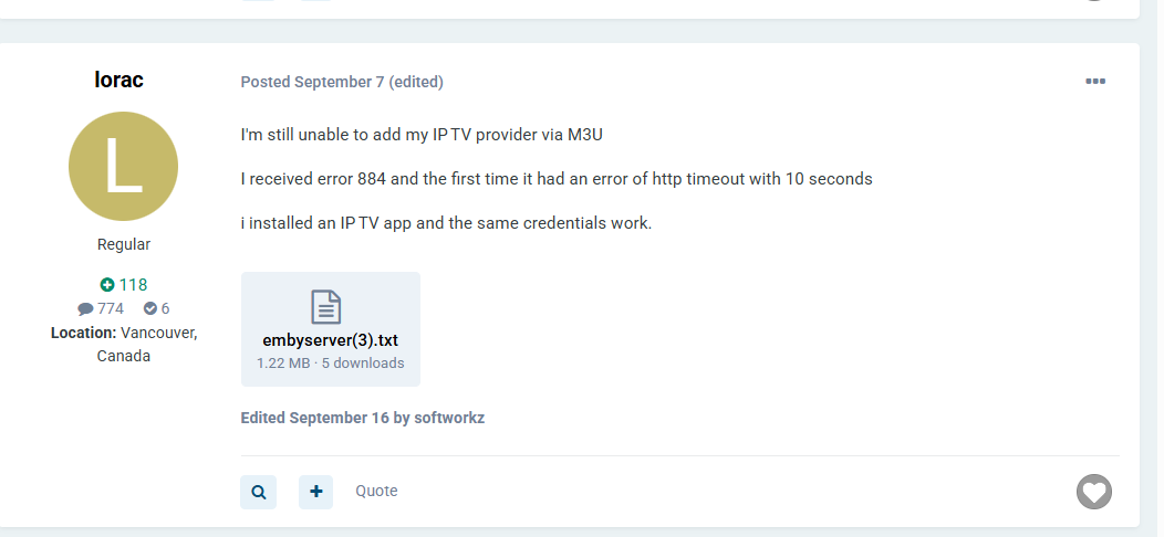 Luke 42077 Posted September 30, 2025 Posted September 30, 2025 1 hour ago, jgonz878 said: I’ll need to investigate the 884 error code and determine the reason behind its immediate rejection. The response time is so rapid that it’s difficult to believe Emby can reject a response so quickly. Interestingly, any IPTV URL from different providers is being rejected by Emby. I’m considering creating a new Emby account to see if it rejects or accepts the URL just to debunk this. Hi, Emby is not rejecting a response. The m3u server is rejecting the request and Emby Server is acting based upon that.