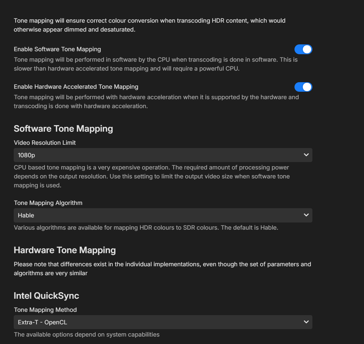 rekit 16 Posted September 30, 2025 Author Posted September 30, 2025 (edited) 3 minutes ago, Luke said: Hi there, let's look at an example. Please attach the information requested in how to report a media playback issue. Thanks! I was mistaken, it's only broken when HW tonemapping is enabled for HDR playback. When I disable HW accelerated tone mapping, quicksync is used. Still testing and will upload logs in a few. edit: ok so when HW accelrated tone mapping is activated, quicksync seems to not work (software encoding only), even when both quicksync tone mapping method and caapi tone mapping method are set to disabled (or set to any of the other options). the only way to make HW transcoding work with quicksync is by setting "enable hardware acclerated tone mapping" to disabled Edited September 30, 2025 by rekit