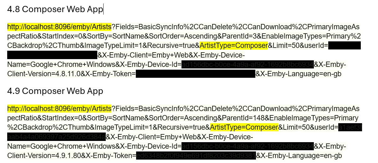 Sorry: just to clarify: the console responses above are still the API queries. If I check the console of the Emby UI direct, then i still get much longer URLs, I can provide them if needed.