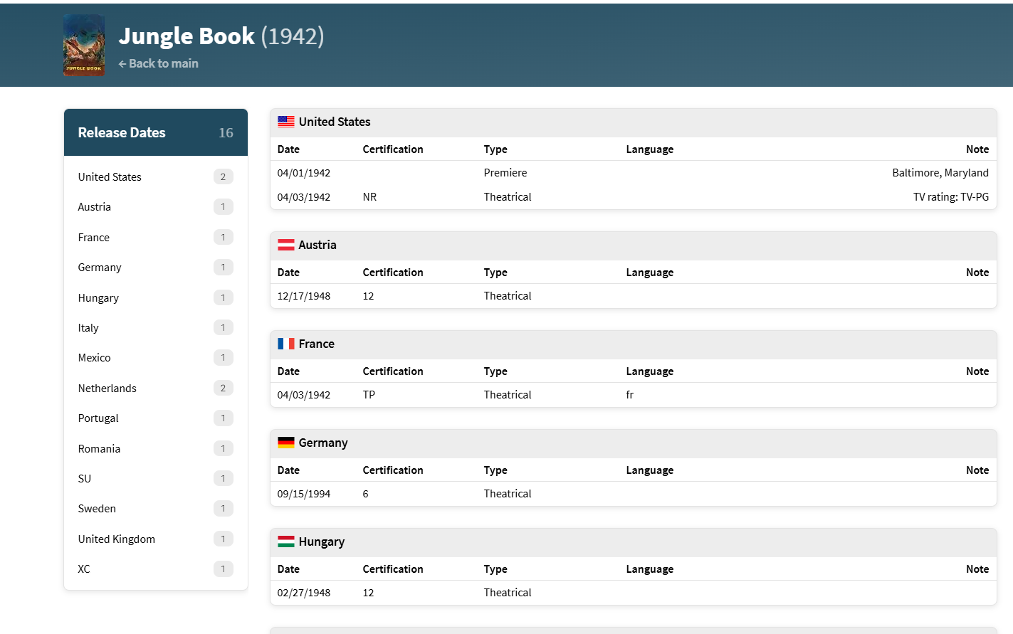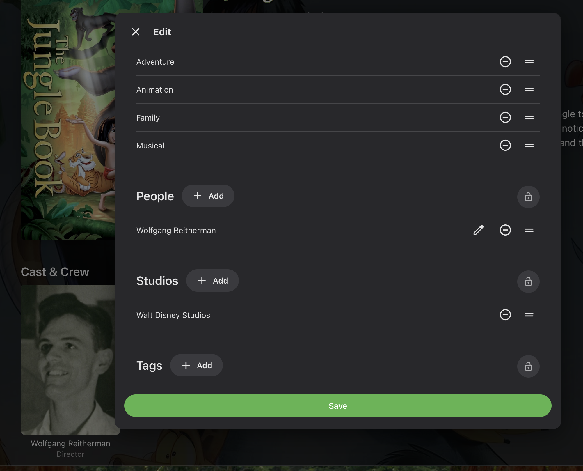 Happy2Play 9780 Posted October 4, 2025 Posted October 4, 2025 1 hour ago, rdf52 said: I have already tried what you are asking. I never use the name, always the ID. But in this instance I tried your suggestion again, and the movie is showing the correct details but still no actors, just the director. What is your library metadata provider order? But even with year the api list 3 versions as the 1967 version has other countries with release date of 1994. Spoiler { "page": 1, "results": [ { "adult": false, "backdrop_path": "/zj8XS0l1cWStpKnuD1LFMB3VoV1.jpg", "genre_ids": [10751, 16, 12], "id": 9325, "original_language": "en", "original_title": "The Jungle Book", "overview": "The boy Mowgli makes his way to the man-village with Bagheera, the wise panther. Along the way he meets jazzy King Louie, the hypnotic snake Kaa and the lovable, happy-go-lucky bear Baloo, who teaches Mowgli \"The Bare Necessities\" of life and the true meaning of friendship.", "popularity": 8.7476, "poster_path": "/9BgcTVV43dZ8A1TpuXWkuNTXtfI.jpg", "release_date": "1967-10-18", "title": "The Jungle Book", "video": false, "vote_average": 7.276, "vote_count": 6461 }, { "adult": false, "backdrop_path": "/5lOwzugTtyk5aREUmMmGgK9UuuM.jpg", "genre_ids": [10751, 12, 18], "id": 10714, "original_language": "en", "original_title": "The Jungle Book", "overview": "Raised by wild animals since childhood, Mowgli is drawn away from the jungle by the beautiful Kitty. But Mowgli must eventually face corrupt Capt. Boone, who wants both Kitty's hand and the treasures of Monkey City – a place only Mowgli can find.", "popularity": 3.3065, "poster_path": "/rYoE6cuup9Ofam6AuYaiJLxF9OO.jpg", "release_date": "1994-12-23", "title": "The Jungle Book", "video": false, "vote_average": 5.9, "vote_count": 476 }, { "adult": false, "backdrop_path": "/7m7APJ99k0A6ojExFTKI3lU3ijV.jpg", "genre_ids": [12, 14, 10751], "id": 23033, "original_language": "en", "original_title": "Jungle Book", "overview": "Mowgli, lost in the jungle when a toddler, raised by wolves, years later happens upon his human village and reconnects with its inhabitants, including his widowed mother. Continuing to maintain a relationship with the jungle, adventures follow.", "popularity": 1.4961, "poster_path": "/zYkffyYCFO1Li1f20MyaAYUaYC4.jpg", "release_date": "1942-04-03", "title": "Jungle Book", "video": false, "vote_average": 6.33, "vote_count": 109 } ], "total_pages": 1, "total_results": 3 Reidentifed by name and selected middle version and had to refresh the page to update the new api data 9 hours ago, Luke said: are you able to report this to them? The issue is other country release dates as all the versions has a 1994 release date somewhere. 1967 So this specific example will probably be wrong all the time per their multiple release date system. 1