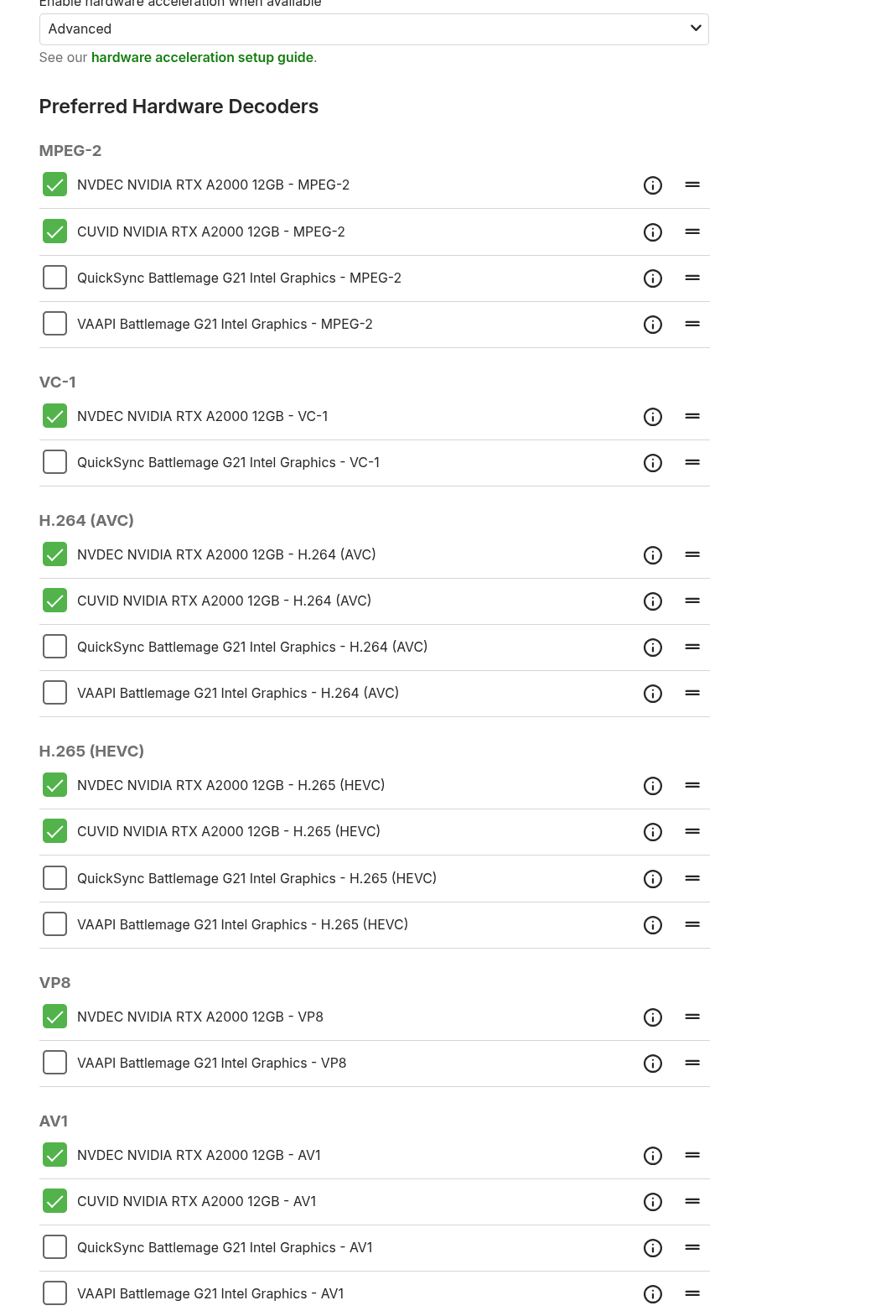 RetroZelda 6 Posted October 2, 2025 Posted October 2, 2025 I wasnt sure if I should post this question here or in the linux section, so i apologise if it should be over there. Anyway, I have my emby server(v4.9.1.80) running on a debian testing(forky) instance and everything is running fine, however I am attempting to transition to an Intel Arc B50 from an RTX A2000 and so far everything regarding the drivers seems ok, but the B50 isnt getting recognised by emby. Based on the kernel requirements listed here: https://dgpu-docs.intel.com/devices/hardware-table.html i should be running what I need(im on kernel 6.16.3) I have both cards connected to the motherboard and this is what I see inside Emby: im fairly confident that I have the B50's drivers setup and working because of the outputs of these commands: Quote $ lspci -k | grep -iA3 vga 25:00.0 VGA compatible controller: Intel Corporation Battlemage G21 [Intel Graphics] Subsystem: Intel Corporation Device 1114 Kernel driver in use: xe Kernel modules: xe -- 2d:00.0 VGA compatible controller: NVIDIA Corporation GA106 [RTX A2000 12GB] (rev a1) Subsystem: NVIDIA Corporation Device 1611 Kernel driver in use: nvidia Kernel modules: nvidia Quote $ vainfo Trying display: wayland Trying display: x11 error: can't connect to X server! Trying display: drm libva info: VA-API version 1.22.0 libva info: Trying to open /usr/lib/x86_64-linux-gnu/dri/iHD_drv_video.so libva info: Found init function __vaDriverInit_1_22 libva info: va_openDriver() returns 0 vainfo: VA-API version: 1.22 (libva 2.22.0) vainfo: Driver version: Intel iHD driver for Intel(R) Gen Graphics - 25.3.4 () vainfo: Supported profile and entrypoints VAProfileNone : VAEntrypointVideoProc VAProfileMPEG2Simple : VAEntrypointVLD VAProfileMPEG2Main : VAEntrypointVLD VAProfileH264Main : VAEntrypointVLD VAProfileH264Main : VAEntrypointEncSlice VAProfileH264High : VAEntrypointVLD VAProfileH264High : VAEntrypointEncSlice VAProfileJPEGBaseline : VAEntrypointVLD VAProfileJPEGBaseline : VAEntrypointEncPicture VAProfileH264ConstrainedBaseline: VAEntrypointVLD VAProfileH264ConstrainedBaseline: VAEntrypointEncSlice VAProfileVP8Version0_3 : VAEntrypointVLD VAProfileHEVCMain : VAEntrypointVLD VAProfileHEVCMain : VAEntrypointEncSlice VAProfileHEVCMain10 : VAEntrypointVLD VAProfileHEVCMain10 : VAEntrypointEncSlice VAProfileVP9Profile0 : VAEntrypointVLD VAProfileVP9Profile1 : VAEntrypointVLD VAProfileVP9Profile2 : VAEntrypointVLD VAProfileVP9Profile3 : VAEntrypointVLD VAProfileHEVCMain12 : VAEntrypointVLD VAProfileHEVCMain422_10 : VAEntrypointVLD VAProfileHEVCMain422_10 : VAEntrypointEncSlice VAProfileHEVCMain422_12 : VAEntrypointVLD VAProfileHEVCMain444 : VAEntrypointVLD VAProfileHEVCMain444 : VAEntrypointEncSlice VAProfileHEVCMain444_10 : VAEntrypointVLD VAProfileHEVCMain444_10 : VAEntrypointEncSlice VAProfileHEVCMain444_12 : VAEntrypointVLD VAProfileHEVCSccMain : VAEntrypointVLD VAProfileHEVCSccMain : VAEntrypointEncSlice VAProfileHEVCSccMain10 : VAEntrypointVLD VAProfileHEVCSccMain10 : VAEntrypointEncSlice VAProfileHEVCSccMain444 : VAEntrypointVLD VAProfileHEVCSccMain444 : VAEntrypointEncSlice VAProfileAV1Profile0 : VAEntrypointVLD VAProfileAV1Profile0 : VAEntrypointEncSlice VAProfileHEVCSccMain444_10 : VAEntrypointVLD VAProfileHEVCSccMain444_10 : VAEntrypointEncSlice I have attached both the hardware detection log and the main emby log. hardware_detection-63894944486.txt embyserver.txt