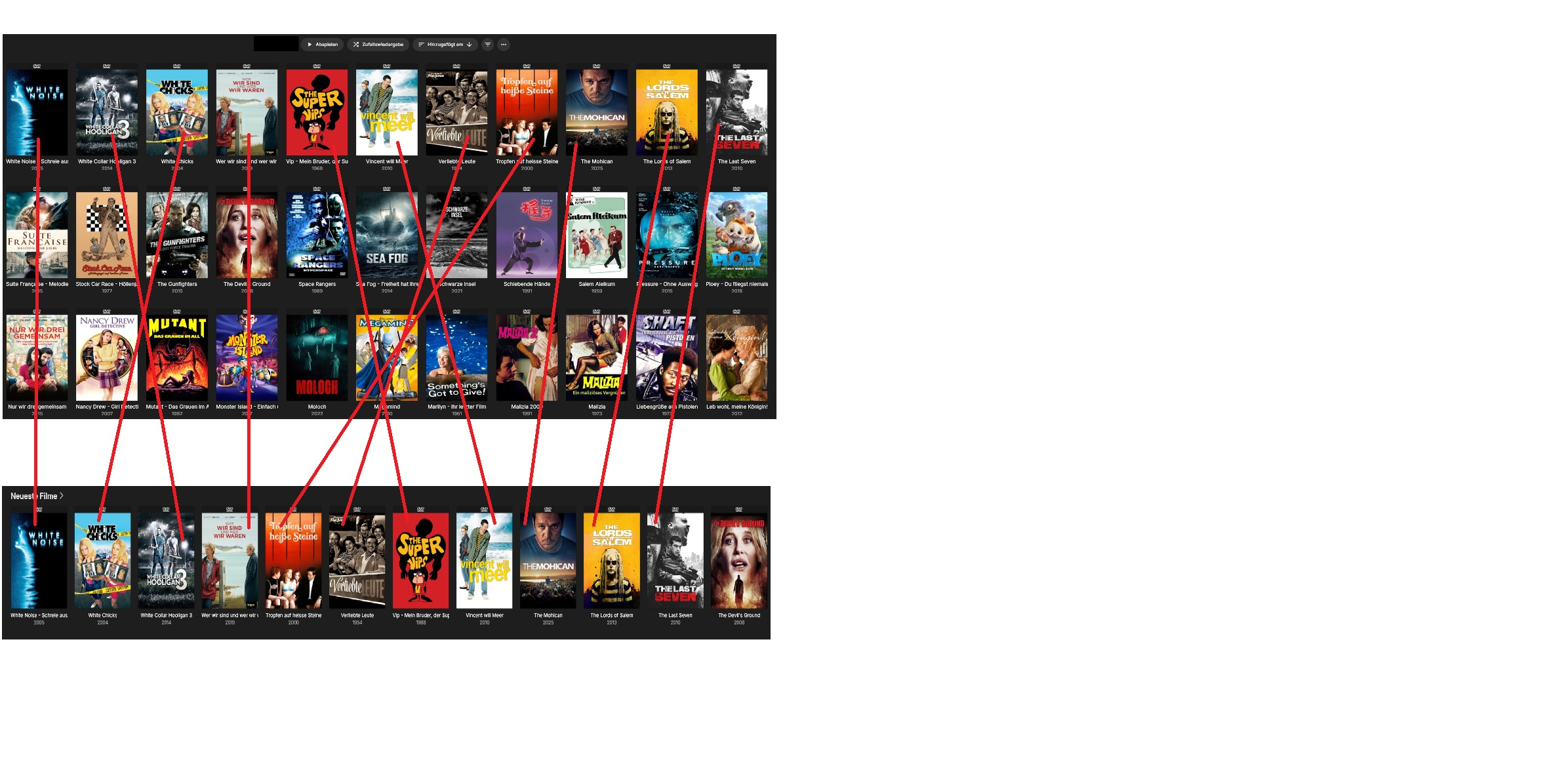 sCampi85 1 Posted October 6, 2025 Posted October 6, 2025 Hi all, Is - Situation: Neuste Filme the sequence is missing movies also the view is different from the main Filme bibliothek sorted by "added latest". In the direkt view of Filme Bibliothek sorted by hinzugefügt am: As you can see movies are missing and the sequence is complete different. Shouldn´t it be the same like for "Neueste Fime"? My cofig is the use of the "Date of added into Bibliothek" Does anyone have a solution for that? I went trough all settings but didn`t find any differents in the setup. KR sCampi