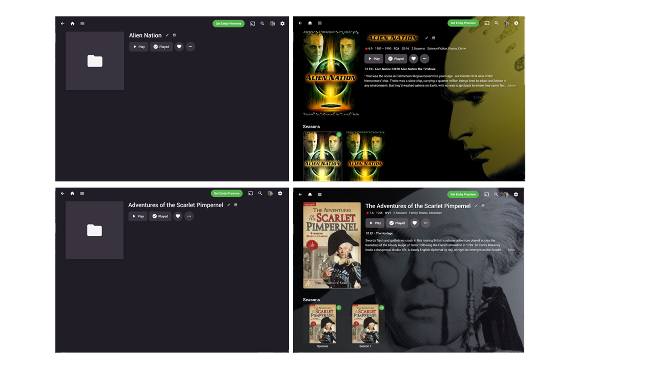 Happy2Play 9780 Posted October 6, 2025 Posted October 6, 2025 9 minutes ago, TheNixie said: Just for clarity - My starting place was trying to understand whether this is an error to fix, or a behavior I need to understand in order to learn how to work with it. My tentative understanding now is that "nothing at all appearing in that space" seems like an error - am I getting that right? In my experience no it is not normal as Emby should ingest properly structures series that way from a TV Show content type library or properly structure via Mixed Content. As that is all I did in my example I enabled nfo writer and refreshed Alien Nation and zipped my test here but test was without nfo files present shown earlier. Alien Nation.zip