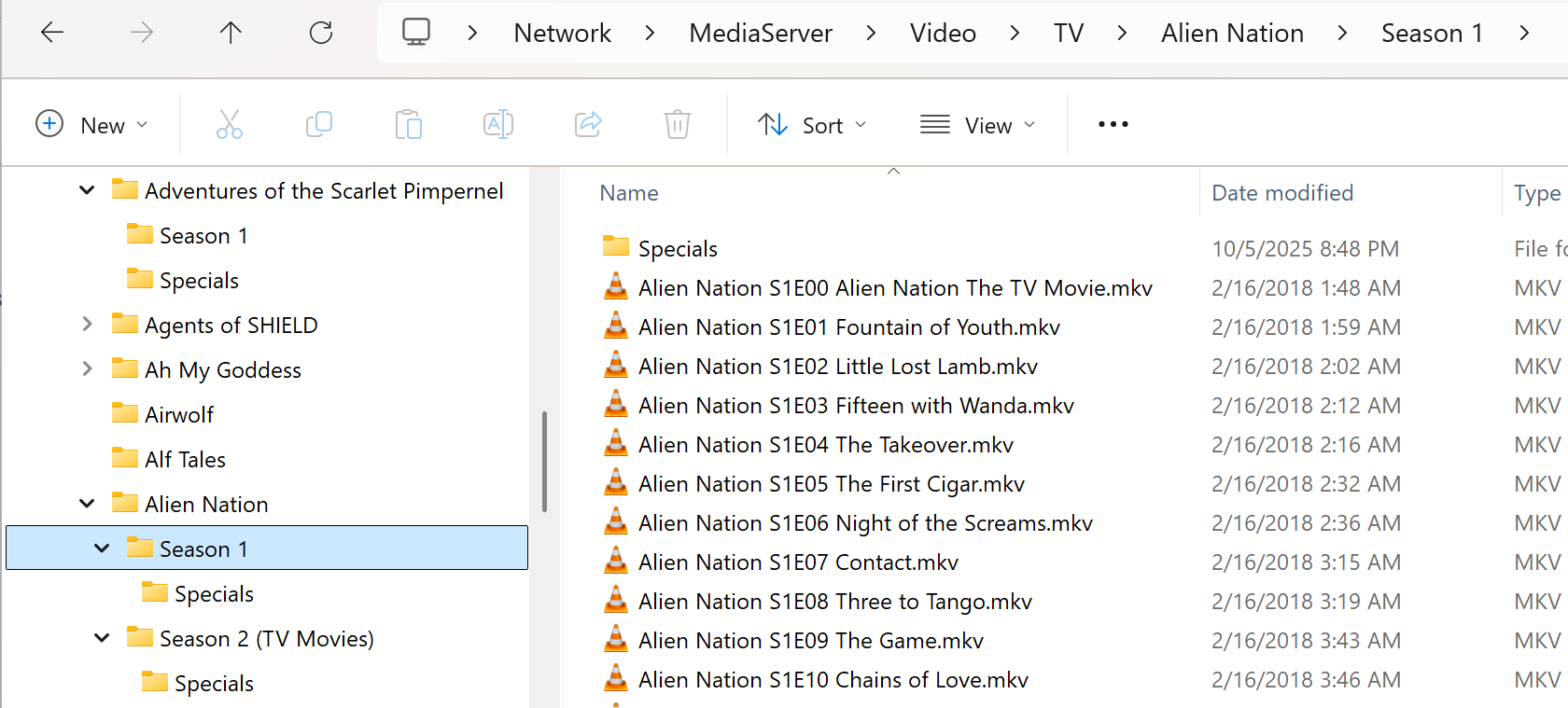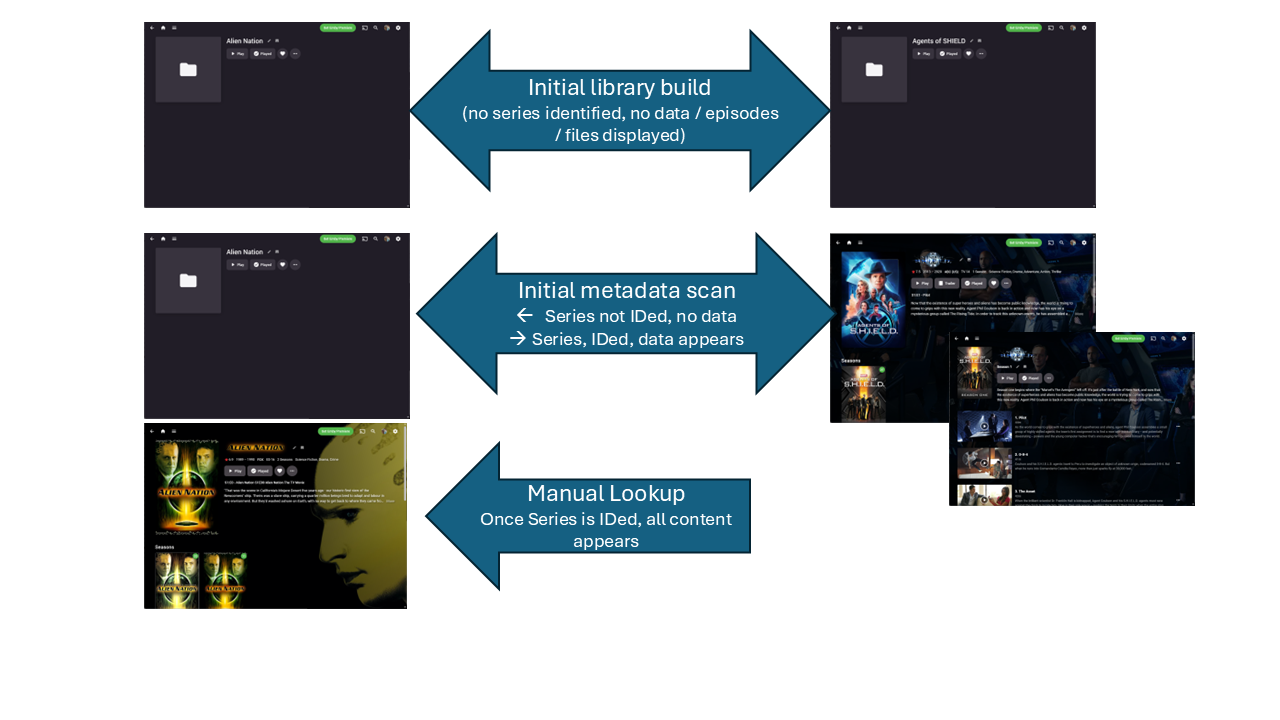 TheNixie 2 Posted October 6, 2025 Author Posted October 6, 2025 "hm" - then perhaps what I have is an error of some sort. Because that is 100% not what I am experiencing. File names and structures are consistent with guide, and when the content overall is recognized, they work just fine. But if a series is not identified by a provider, ZERO content is displayed or findable. You can see the file names, for example, for Alien Nation in the screenie. And once the *series* has been IDed, the content shows up perfectly. *Until the series has been IDed, *nothing shows - the content might as well not exist. I guess maybe I didn't explain clearly enough above, but what you're seeing in the screenies is precisely that: prior to IDing the series, none of the series content is visible in any way the ONLY difference between the left and right side of that image is that at the *series level, I clicked ID and found the series. Once the series is IDed, the content appears. NO other actions were taken, and total elapsed time between left and right images is 30-35 seconds (so it's not that files were scanned or some other server-side). I literally clicked "ID" twice, chose the series from the list - and that action caused all of the season content to display. This behavior has been consistent across 6 test library creations.