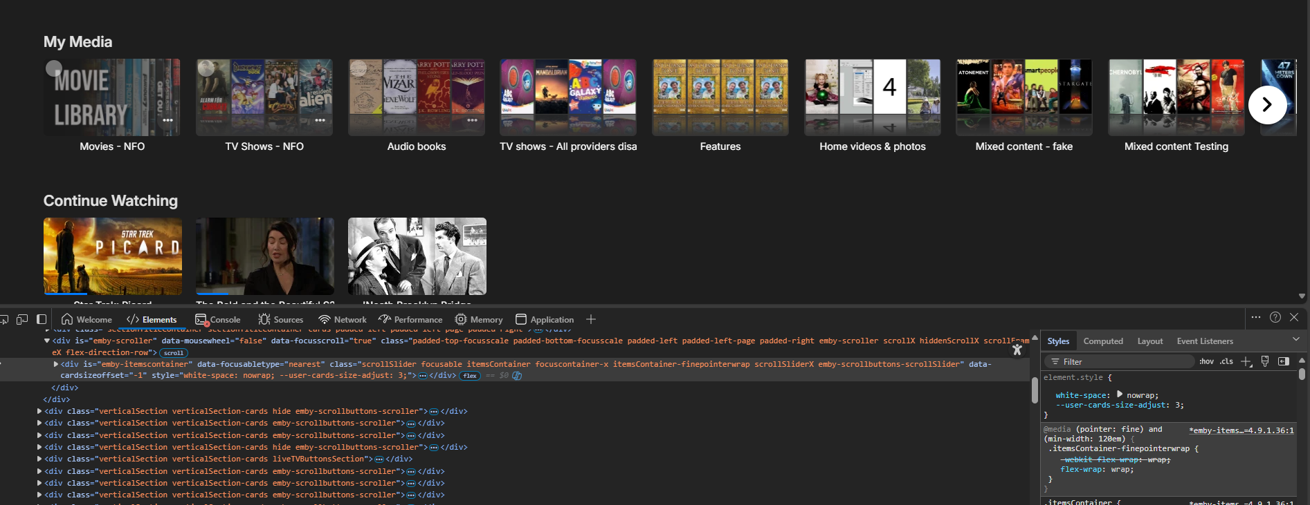 Happy2Play 9780 Posted October 8, 2025 Posted October 8, 2025 Not sure why min-width is not working but this will. If you want My Media small to have a scroller also remove the not section. div.itemsContainer-finepointerwrap:not(.itemsContainer-sideFooters) { -webkit-flex-wrap: nowrap; flex-wrap: nowrap; }