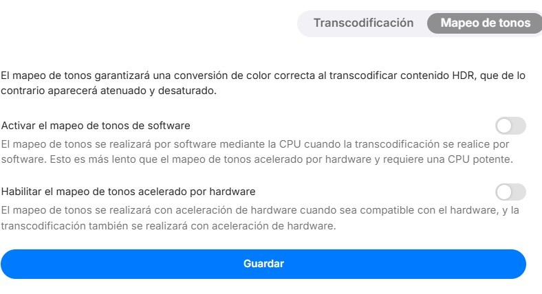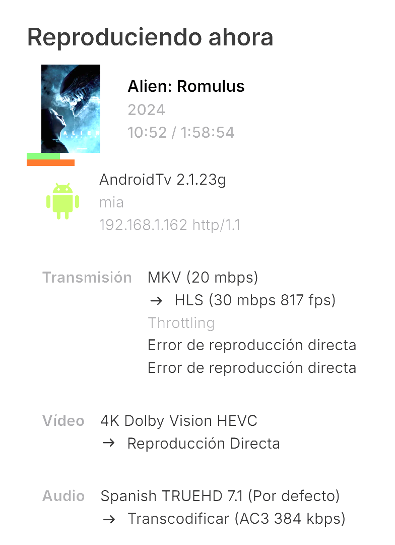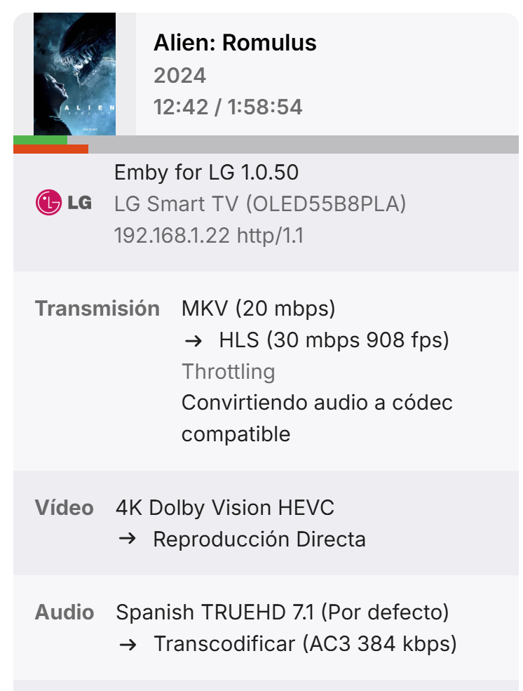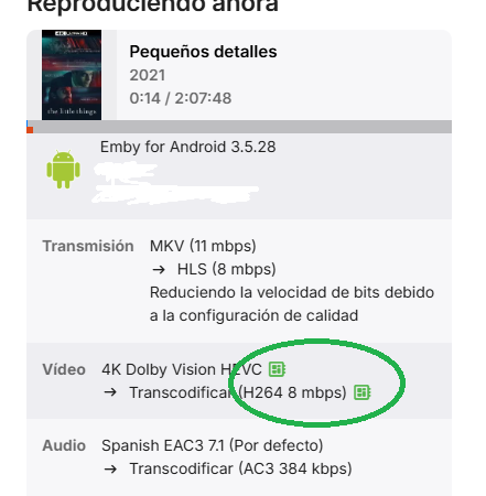 Solution Parpatrus 6 Posted 6 hours ago Solution Posted 6 hours ago 20 hours ago, victor_es said: Si y no, me quedo mas tranquilo sabiendo que eso es normal. Pero me queda aun mas, la película nueva de "Alien", me di cuenta que no carga el HDR con el Xiaomi TV Box S (2nd Gen), y con la TV LG OLED55B8PLA si, y antes me lo cargaba, tanto el HDR como el Dolby Vision, uso ahora el xiaomi para ver cosas con Dolby Vision, y tengo que usara para estas peliculas que solo tienen HDR con la LG oled(OLED55B8PLA), y no me gusta como salen los subtítulos que hacen cosas raras con el idioma español, cada subtitulo con tilde (el idioma español. que llevan tilde, y hay bastantes tilde en este idioma), te ponen una "letra rara/símbolo", en el xiaomi van perfectos, podrías decirles a los técnicos que están trabajando en esto, las TV LG en común, esta mal para estas los subtítulos, y el Dolby Vision no va, por eso estoy usando el xiaomi con la misma TV, y cuando tengo que usar la app emby directamente con la LG por el HDR tengo este problema, te he dicho que lo digas a los técnicos, supongo que será el problema de la aplicación y no de la configuración mía, si acaso es algo de mi configuración, házmelo saber. Menos en la TV OLED55B8PLA, las otras tv LG se pausa, y va mejor eligiendo la calidad "40mbps 4k" En los aparatos android no pasa eso, y la conexión que tengo no se cortado ni una vez, y lo minimo que me llega son 900mbps, y te mande unas fotos anteriores como esta configurado, pero si hay que retocar algo mas para que no se pause mas, lo agradeceré mil veces Hola Victor. seguro que @Luke te ayuda mas que yo. Pero por curiosidad, en que equipo tienes el servidor montado? cuales son sus recursos? Por otra lado veo que todas las emisiones te haces transcodificación, si ves que los clientes (las tv´s) pueden con los medios, yo quitaría eso de la configuración del servidor ya que leí que tenias configurado 4k-200mb, a mi pensar imagino que se te pausan por estar transcodificando a todos los clientes y puede que el servidor no de más de sí. Yo probaría a quitar esas opciones y configurar a los clientes a 4k-200mb o lo máximo que te permita configurarlos y hacer que el servidor haga todo en transmisión directa. Por otro lado si haces transcodificación por hardware fíjate que salgan los iconos verdes , eso te dice si la GPU ayuda en la tarea, las que pones hacen referencia al audio, las tv Samsung no aceptan DTS y algunos codecs de audio, mira según tu modelo tanto en uno como en la LG o cualquiera que usen. Sobre el HDR en emisiones en directo pasan el contenido pero en la transcodificación tienes que ver si en los ajustes del servidor, transcodificación, mapeo de tonos lo tienes activado. Yo no lo tengo activado por que tengo todo en transmisión directa, así no saturo el servidor y todo va mas suave.
