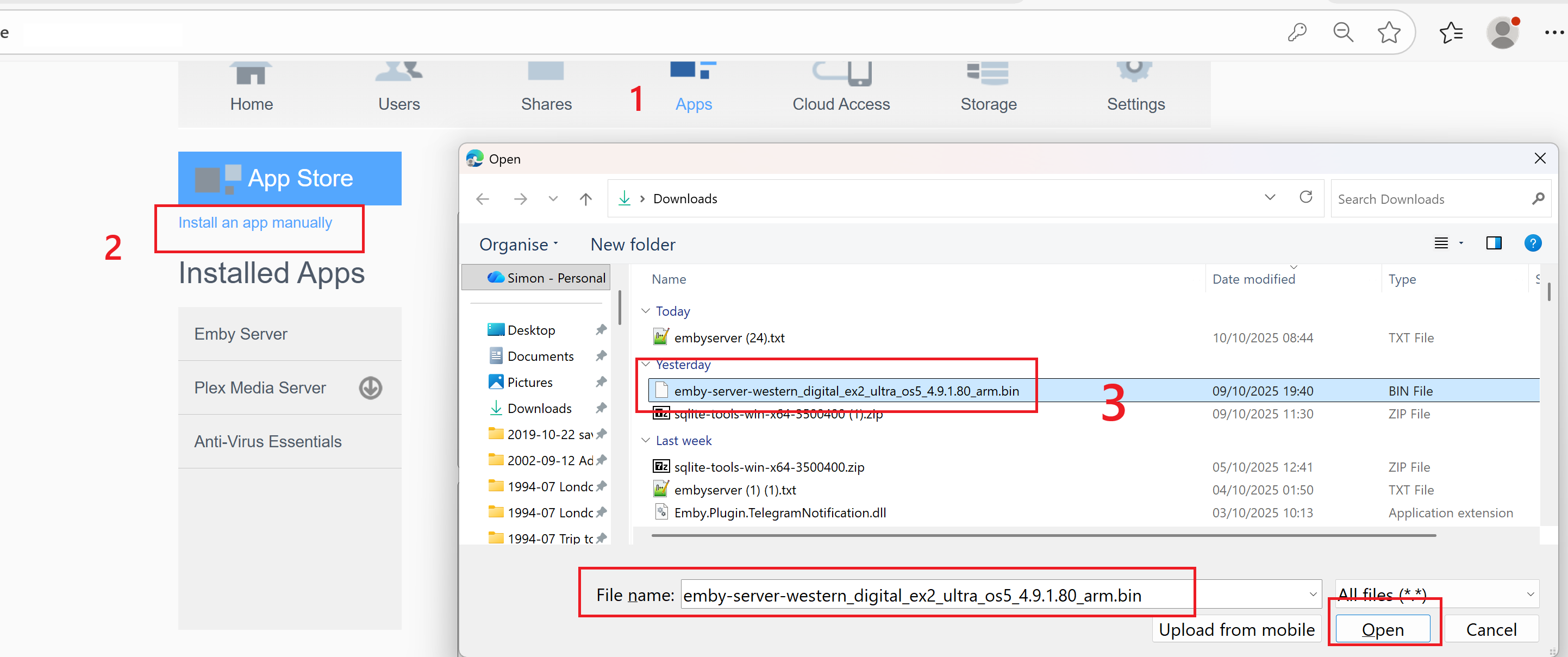 sa2000 673 Posted October 10, 2025 Posted October 10, 2025 38 minutes ago, noinch said: "" means to install it using KiTTY (PuTTY sux)? No Just the load the WD Dashboard and login with the admin account for the NAS Then select Apps Click on Emby Server below Installed App - i assume you have an existing old version installed and then toggle "Run App" to the off position to make sure it is stopped then click on "Install An App Manually" and install the 4.9.1.80 binary package