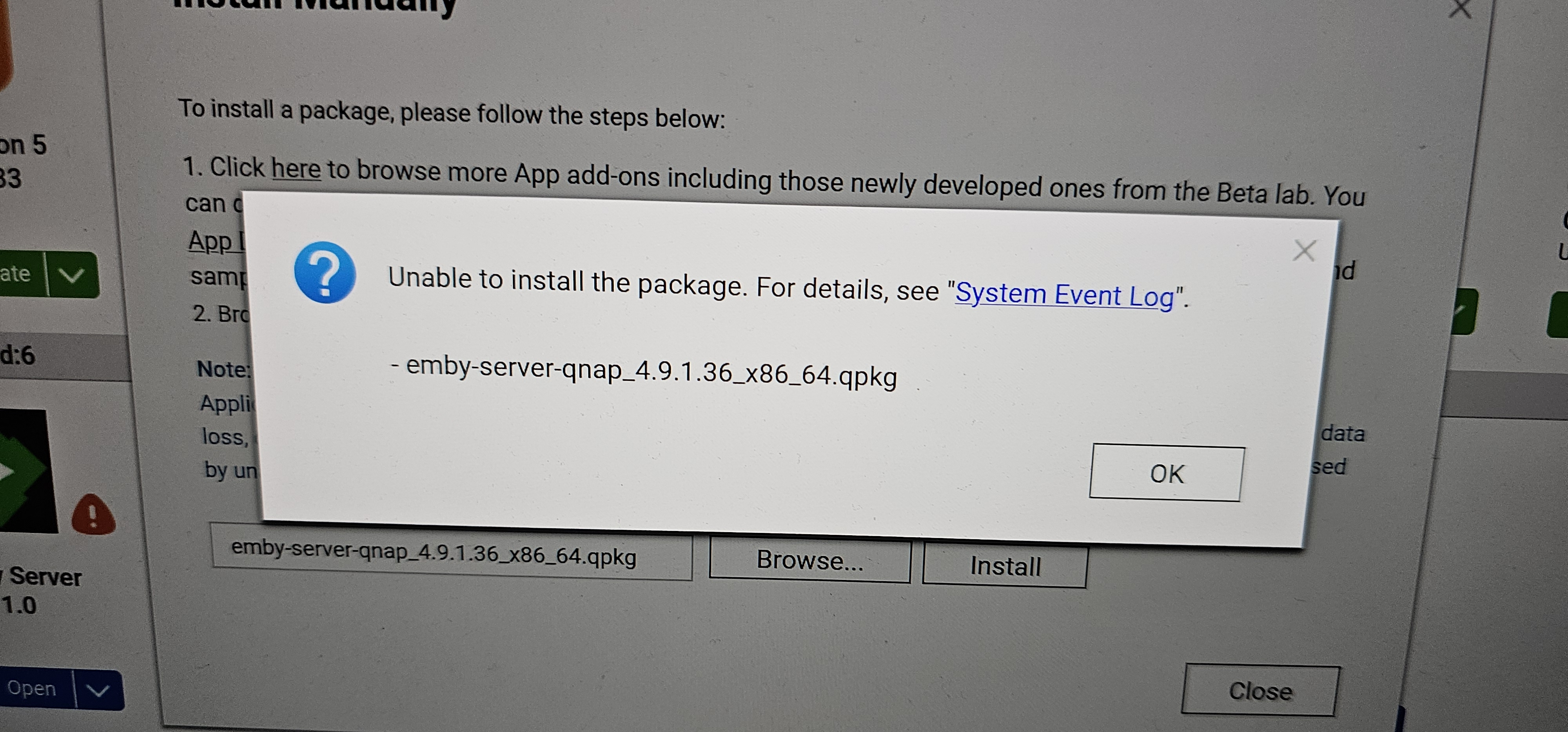 Luke 42077 Posted October 9, 2025 Posted October 9, 2025 As a test, are you able to install this? https://github.com/MediaBrowser/Emby.Releases/releases/download/4.8.11.0/emby-server-qnap_4.8.11.0_x86_64.qpkg This is the 4.8.11 release that you already have, so that would just be installing the same version on top of itself.