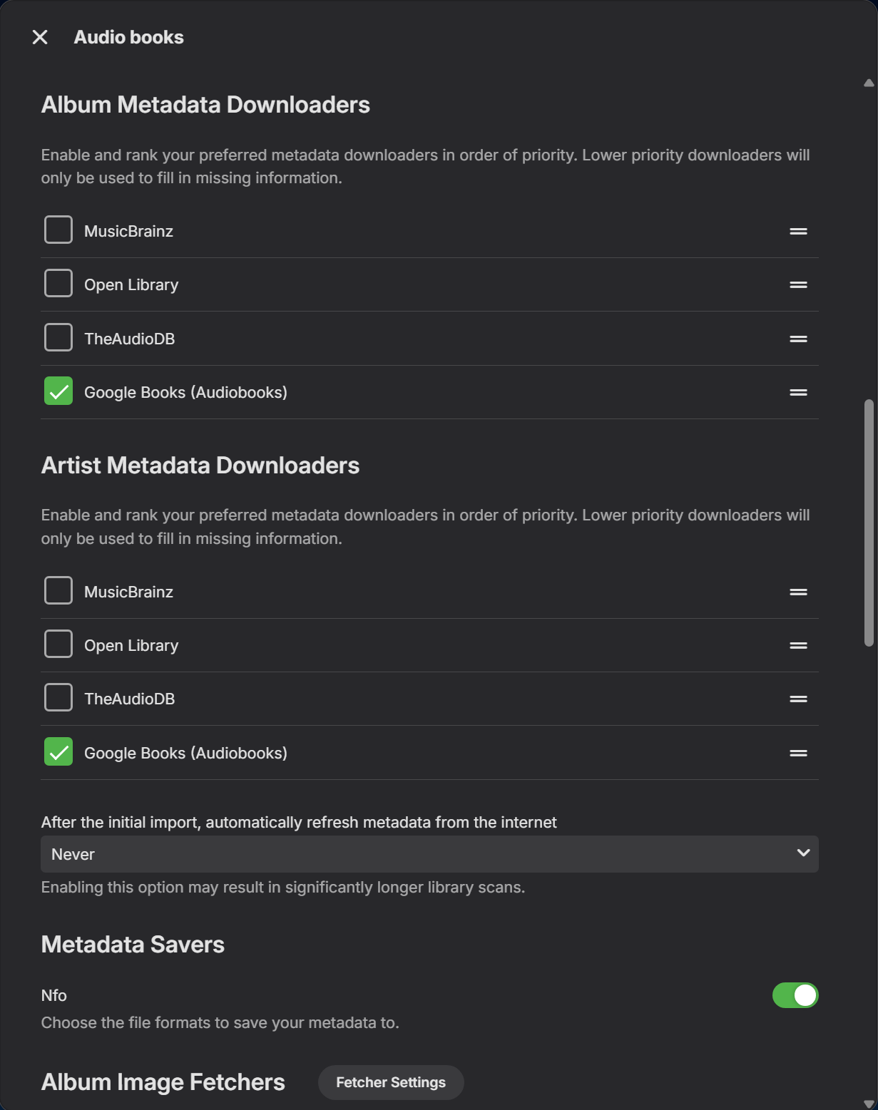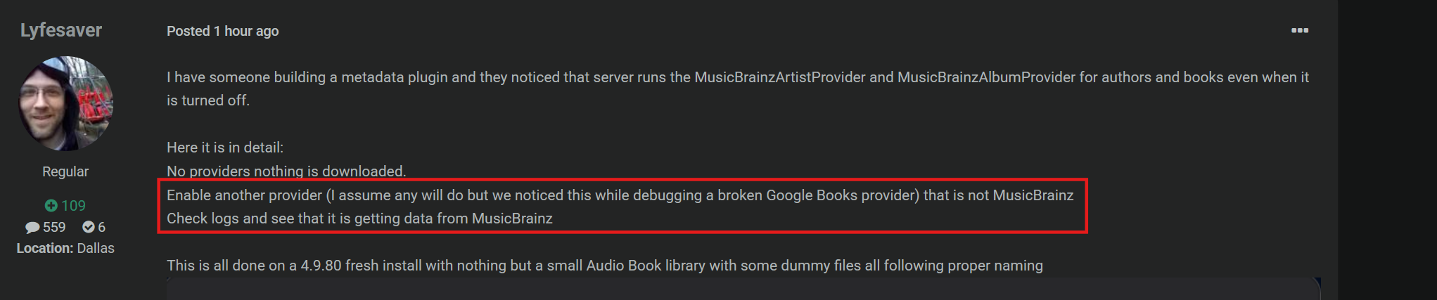 Lyfesaver 133 Posted October 11, 2025 Author Posted October 11, 2025 56 minutes ago, Neminem said: That odd, I'm not seeing it. Can you try enabling it and push save, then move out of library, back in disable, and try again. First off, thanks for trying to replicate!!! Thats very nice of you Secondly, kudos on the book choice. Clive Barker.... niiiice Thirdly, if no providers where is that info coming from? I am guessing from MP3 tags. This was an issue for me in testing the Google Books plugin because I thought it was turned off/disabled but it is not. So, what I did was just grab some MP3 sound files I used on my Twitch stream and named them 01-Chapter 1.mp3, etc. This eliminates MP3 tag info 100%. You screenshot confirms my first point tho. When no providers are selected, no data is fetched. However, when I ticked my Google Books: The GB provider does not work but I was not aware of that first because data was showing up in the library. I sent the plugin back to the dev to fix and after a bit of back and forth I noticed the "MusicBrainz" link in the bottom and mentioned it to him. He told me to look in the logs and low and behold, MusicBrainz was going to town. I asked him to be sure it was not the plugin doing it and he sent me a screenshot of his VSS with a search for the word brain and musicbrainz both returning none. So I made this thread here. 1
