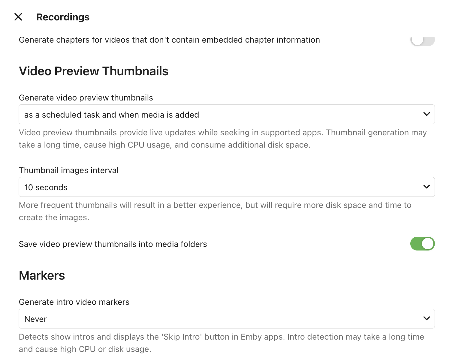 MediaFish 1 Posted October 11, 2025 Posted October 11, 2025 Hello, I've been using Emby Server for years on a Windows host. I'm trying to move to new hardware and have been unable to have preview thumbnails generated for new media (mostly recorded TV). For the library I record to, I have Video Preview Thumbnails set to "as a scheduled task and when media is added" and I have the interval set to 10 seconds. I've tried rescanning the library, refreshing the metadata and running the video preview thumbnail extraction task manually all with no luck. I've attached the server log file but don't see anything obvious in there. Any clues on what I'm doing wrong here? I really appreciate the help and work you do on Emby! embyserver.txt