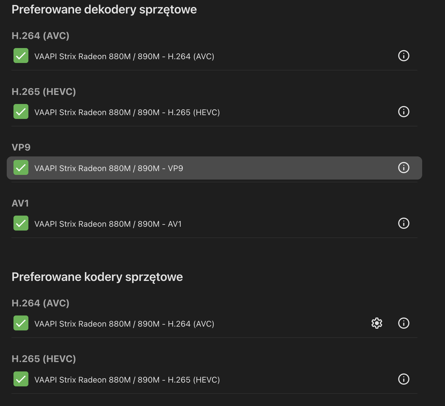 Smiehu 6 Posted October 14, 2025 Posted October 14, 2025 Hello, I have problem with HW transcoding with AMD AI 9 HX PRO 370 and Radeon™ 890M GPU. Transcoding seems to work but I have no video during playback (only audio). OS: Unraid 7.1.4 Emby: 4.9.1.80 (docker by linuxserver) GPU is recognized in Transcoding options (screen in attachment). During playback there is info that movie is transcoding by GPU (Vaapi) but no video during playback only audio and subtitles. A lot of errors in log. What can I do? ffmpeg-transcode-23429bfd-39d8-4f62-bcfe-ef7d3b1badc8_1.txt 1