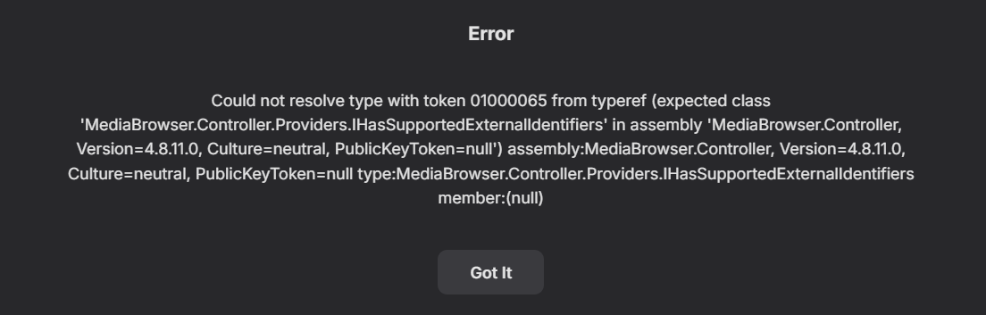 RustyBike 12 Posted October 23, 2025 Author Posted October 23, 2025 Hi Luke I included the embyserver.txt log file for the 23rd (today), so hopefully the Refresh Users Failed event is in there. If you like though, I can download the logs for those previous days too if you think it'll help (they were on the old version of Emby I was running) I finally updated to the new version today. I clicked on the i on the side of the 23rd one and it shows this information: 10/23/25, 12:47 AM Could not resolve type with token 01000065 from typeref (expected class 'MediaBrowser.Controller.Providers.IHasSupportedExternalIdentifiers' in assembly 'MediaBrowser.Controller, Version=4.8.11.0, Culture=neutral, PublicKeyToken=null') assembly:MediaBrowser.Controller, Version=4.8.11.0, Culture=neutral, PublicKeyToken=null type:MediaBrowser.Controller.Providers.IHasSupportedExternalIdentifiers member:(null) at Emby.Providers.Manager.ProviderManager.CanRefresh (MediaBrowser.Controller.Providers.IImageProvider provider, MediaBrowser.Controller.Entities.BaseItem item, MediaBrowser.Model.Configuration.LibraryOptions libraryOptions, MediaBrowser.Controller.Providers.ImageRefreshOptions refreshOptions, System.Boolean ignoreMetadataLock, System.Boolean ignoreLibraryOptions) [0x00033] in <314f910e33874571b0bf3c515dedf0a7>:0 at Emby.Providers.Manager.ProviderManager+<>c__DisplayClass44_0.b__0 (MediaBrowser.Controller.Providers.IImageProvider i) [0x00000] in <314f910e33874571b0bf3c515dedf0a7>:0 at System.Linq.Enumerable+WhereArrayIterator`1[TSource].ToArray () [0x00022] in <2588046b51864568a5990ea49339a193>:0 at System.Linq.Buffer`1[TElement]..ctor (System.Collections.Generic.IEnumerable`1[T] source) [0x0000a] in <2588046b51864568a5990ea49339a193>:0 at System.Linq.OrderedEnumerable`1[TElement].ToArray () [0x00000] in <2588046b51864568a5990ea49339a193>:0 at System.Linq.Enumerable.ToArray[TSource] (System.Collections.Generic.IEnumerable`1[T] source) [0x0001f] in <2588046b51864568a5990ea49339a193>:0 at Emby.Providers.Manager.MetadataService`2[TItemType,TIdType].RefreshMetadata (MediaBrowser.Controller.Entities.BaseItem item, MediaBrowser.Controller.Providers.MetadataRefreshOptions refreshOptions, MediaBrowser.Controller.Entities.BaseItem[] collectionFolders, MediaBrowser.Model.Configuration.LibraryOptions libraryOptions, System.Threading.CancellationToken cancellationToken) [0x00297] in <314f910e33874571b0bf3c515dedf0a7>:0 at MediaBrowser.Controller.Entities.BaseItem.RefreshMetadata (MediaBrowser.Controller.Providers.MetadataRefreshOptions options, MediaBrowser.Controller.Entities.BaseItem[] collectionFolders, MediaBrowser.Model.Configuration.LibraryOptions libraryOptions, System.Threading.CancellationToken cancellationToken) [0x00093] in :0 at Emby.Server.Implementations.EntryPoints.RefreshUsersMetadata.Execute (System.Threading.CancellationToken cancellationToken, System.IProgress`1[T] progress) [0x000bb] in <8bd2bb5f77514a08a9b6823c976d37a6>:0 at Emby.Server.Implementations.ScheduledTasks.ScheduledTaskWorker.ExecuteInternal (MediaBrowser.Model.Tasks.TaskOptions options) [0x00258] in <8bd2bb5f77514a08a9b6823c976d37a6>:0 Oh wait, maybe it's not doing the error anymore. I just realized that before I updated the Emby Server, I did update the Nvidia Shield and rebooted it and maybe that Refresh User error is from the old version of Emby Server starting back up again after the Nvidia Shield booted back up. Then I updated the Emby Server, so maybe the Refresh Users error is fixed too. I'll wait a day or two and see if the Refresh Users error continues and report back.