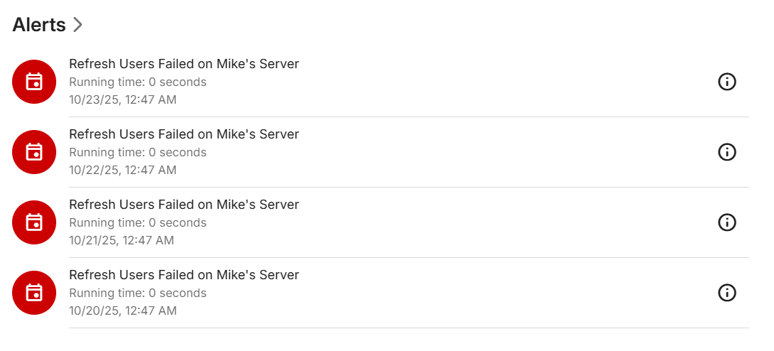 RustyBike 12 Posted October 23, 2025 Author Posted October 23, 2025 Hi Luke I updated the server and the detection of new things added is working again When I go to edit Images, it brings up the proper screen now, so that's fixed too The only issue I see now is the Refresh Users error in the Alerts.