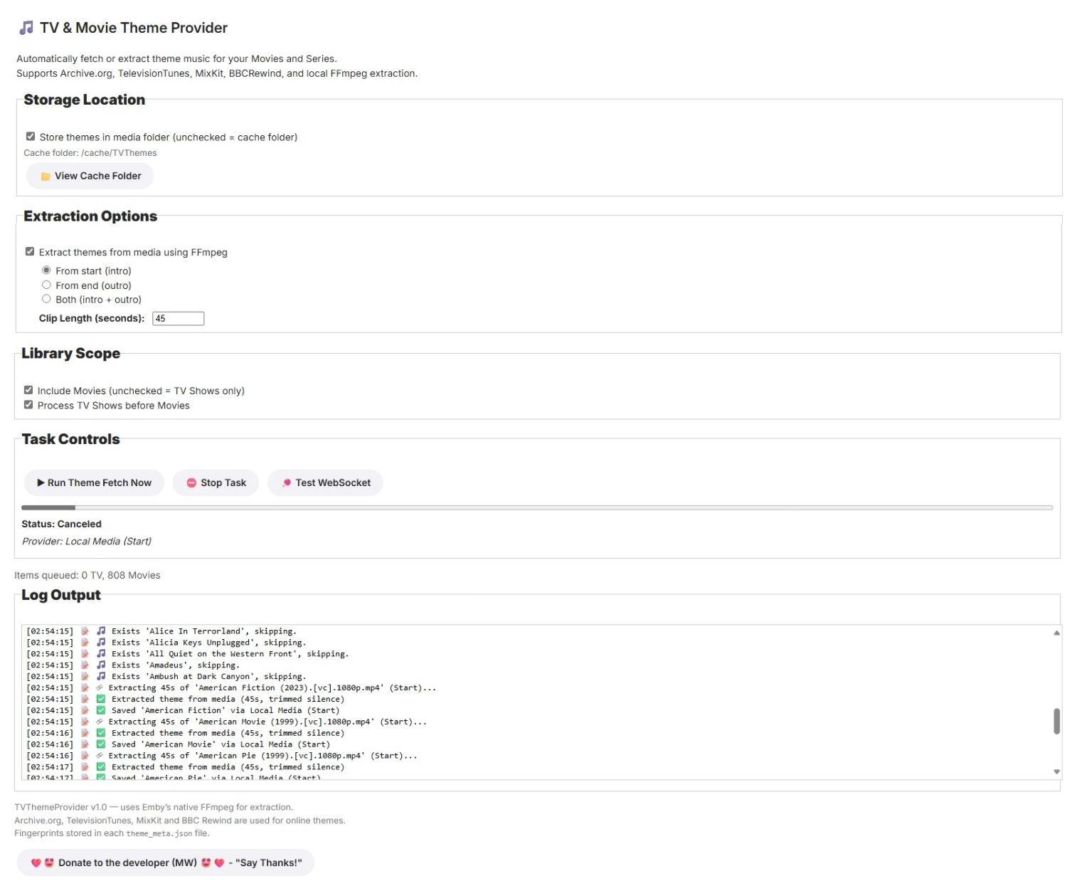 mickle026 650 Posted October 17, 2025 Posted October 17, 2025 (edited) Built for server 4.8.11 + TV&Movie Theme Provider Plugin Overview TV&Movie Theme Provider automatically locates, downloads, or extracts theme music for Movies and TV Series in your Emby library. It integrates multiple free and legal providers — Archive.org, TelevisionTunes, MixKit, and BBC Rewind — with an optional local FFmpeg extractor for generating clean intro/outro MP3 clips directly from your media. The plugin runs as a scheduled Emby task and provides a full Dashboard configuration page featuring live log output, WebSocket updates, and library scan statistics. Step-by-Step Operation Library Scan The scheduled task queries the Emby library through ILibraryManager. TV Series are processed first by default; Movies optionally included. Theme Detection For each item, the plugin searches theme sources in order: Archive.org TelevisionTunes.co.uk MixKit.co BBC Rewind (musicmemories.bbcrewind.co.uk) Download or Extraction If no theme is found online, FFmpeg extracts 45 seconds of audio from the start or end of the video. The extraction uses: bash -t 45 -af silenceremove=start_periods=1:start_threshold=-40dB ensuring silence is trimmed. Storage Themes can be saved in the media’s folder or a cache directory, based on user settings. Fingerprint & Metadata Each successful theme creates a theme_meta.json with SHA-256 fingerprint, provider, licence, and timestamp. Dashboard Feedback A WebSocket channel TVThemeProvider streams progress messages to the dashboard page (tvthemeprovider.html / .js). Users see real-time status, provider name, progress bar, and log output. Process Flow flowchart TD A[Start Task] --> B[Load Plugin Config] B --> C[Query Library (Series / Movies)] C --> D{Existing Theme?} D -->|Yes| E[Skip] D -->|No| F[Try Providers<br>Archive→TelevisionTunes→MixKit→BBC Rewind] F -->|Found| G[Save MP3 + JSON Metadata] F -->|Not Found| H[Extract with FFmpeg<br>Trim Silence 45 s] H --> I[Compute Fingerprint] G --> I I --> J[Broadcast via WebSocket] J --> K[Next Item] K --> L[Complete + Summary] Conclusion The TVThemeProvider Plugin is a complete, legally-safe theme music engine for Emby. It automatically retrieves or extracts high-quality theme MP3s, maintains consistent metadata, and keeps you informed in real time via a responsive dashboard. With BBC Rewind support and WebSocket integration, this plugin enriches your media library MediaBrowser.Plugins.TVThemeProvider.dll MixKit and BBC Rewind have been removed , MixKit is unauthorised and contains samples anyway so is not valid, BBC Rewind have removed the media and discontinued but left their api up, so 404's galore. That one is a shame Fixed tv Series extractions and added code to honour intro markers, although I havent tested it yet. Im away for the week now, so I have posted it anyway, im sure you ll let me know if it aint working MediaBrowser.Plugins.TVThemeProvider.1.0.0.1.zip Edited October 20, 2025 by mickle026 3