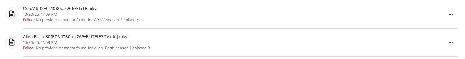 the.chad 0 Posted October 20, 2025 Author Posted October 20, 2025 Gah sorry, example is obvious to provide! Attached logs have me attempting to auto-organize Alien Earth Season 1 Episode 3. Attached is the error msg it shows on the plugin menu. From prior server logs, I've attempted this at 2025-10-20 22:01:40.289 I also enabled debug mode in logs and tried again at 2025-10-20 22:10:48.553 if it provides any extra info that would help.