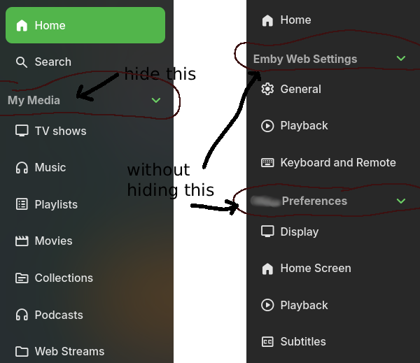 howllor 26 Posted October 24, 2025 Posted October 24, 2025 Hi, I wonder if there is a way to hide the drawer headings that can show or collapse different menu items, but only doing so on the frontend side of things? I managed to hide them globally by using this, but I would quite like to keep them in the settings pages... .navDrawerCollapseButton.noautofocus.emby-collapsible-button.emby-button.button-hoverable { display: none; }