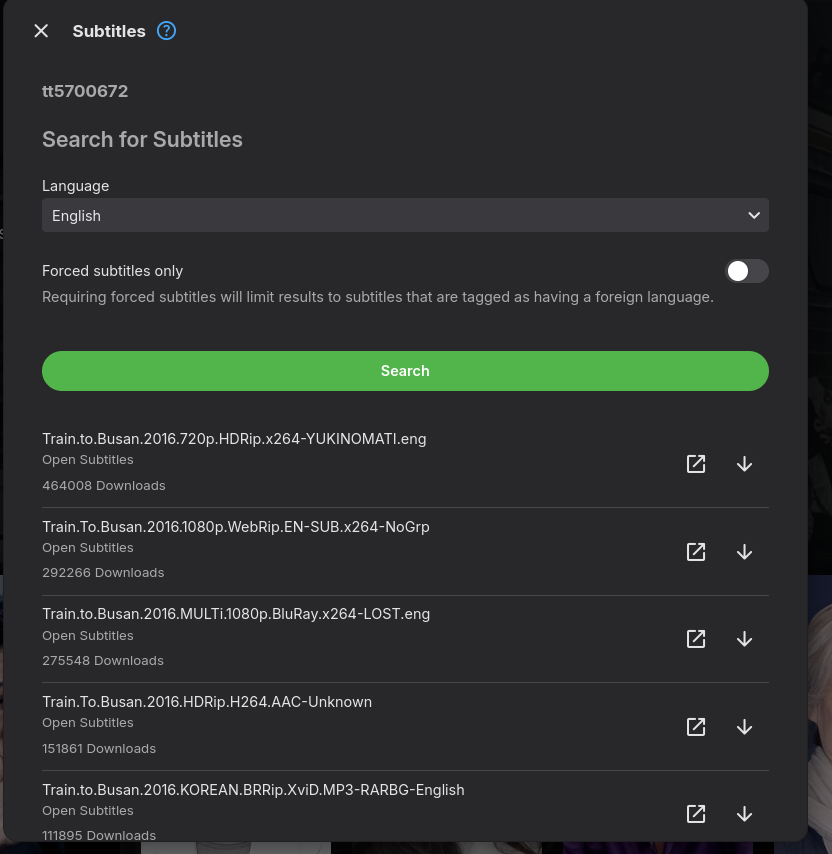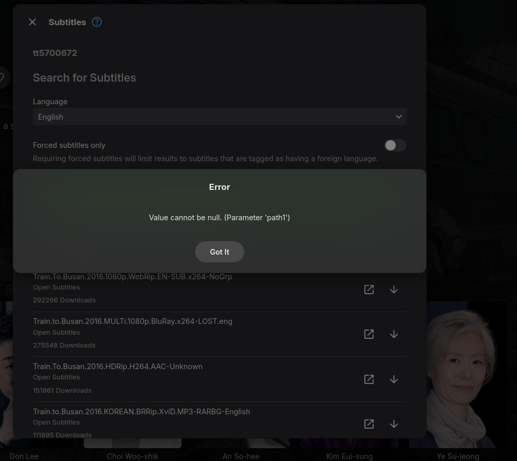 stuffie 1 Posted November 4, 2025 Author Posted November 4, 2025 also seems to be an issue with most of my library i have tried other movies and other subtitles to no avail. screenshots from the search results are attached, On 10/27/2025 at 4:33 PM, Luke said: @stuffiewhat exactly did you check? What did you find? i used tt5700672 to look up the subtitles on opensubtitles.com, also i have VIP so i have increased limit for downloads, for which i am nowhere near my limit.