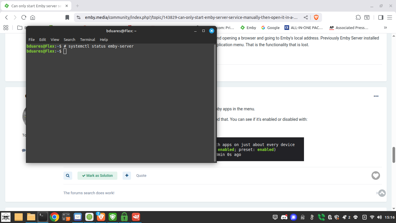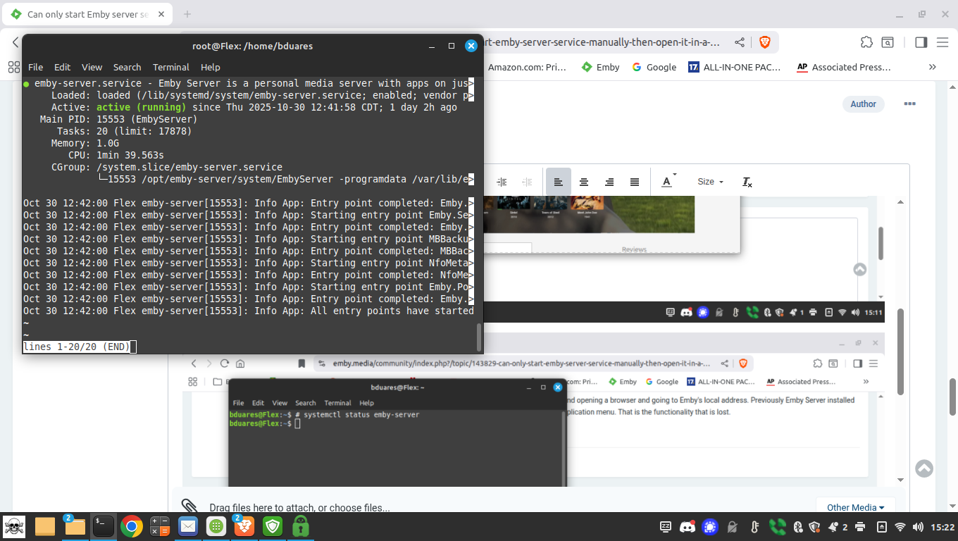 bduares 0 Posted October 31, 2025 Author Posted October 31, 2025 Just rebooted again and checked the server status as root. It is indeed running at startup without my having to run anything from the application menu. Checking on another device I am also able to connect to the server. So that is working, when it was not working previously. The only thing that seems broken now is clicking the Emby Server selection in the application menu no longer opens the server address in a browser automatically. No big issue, I will just just use a bookmark in the browser for that to perform maintenance.