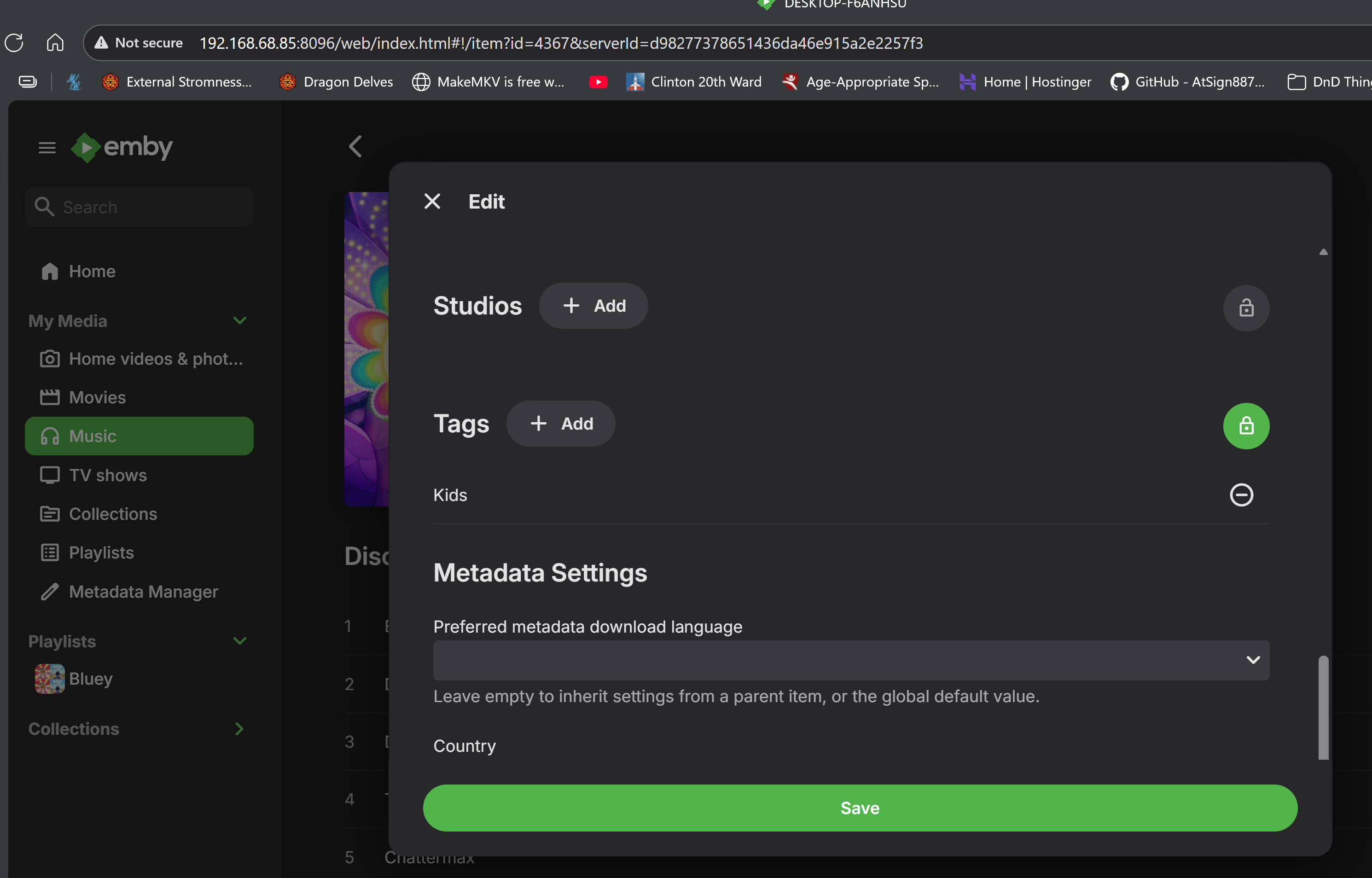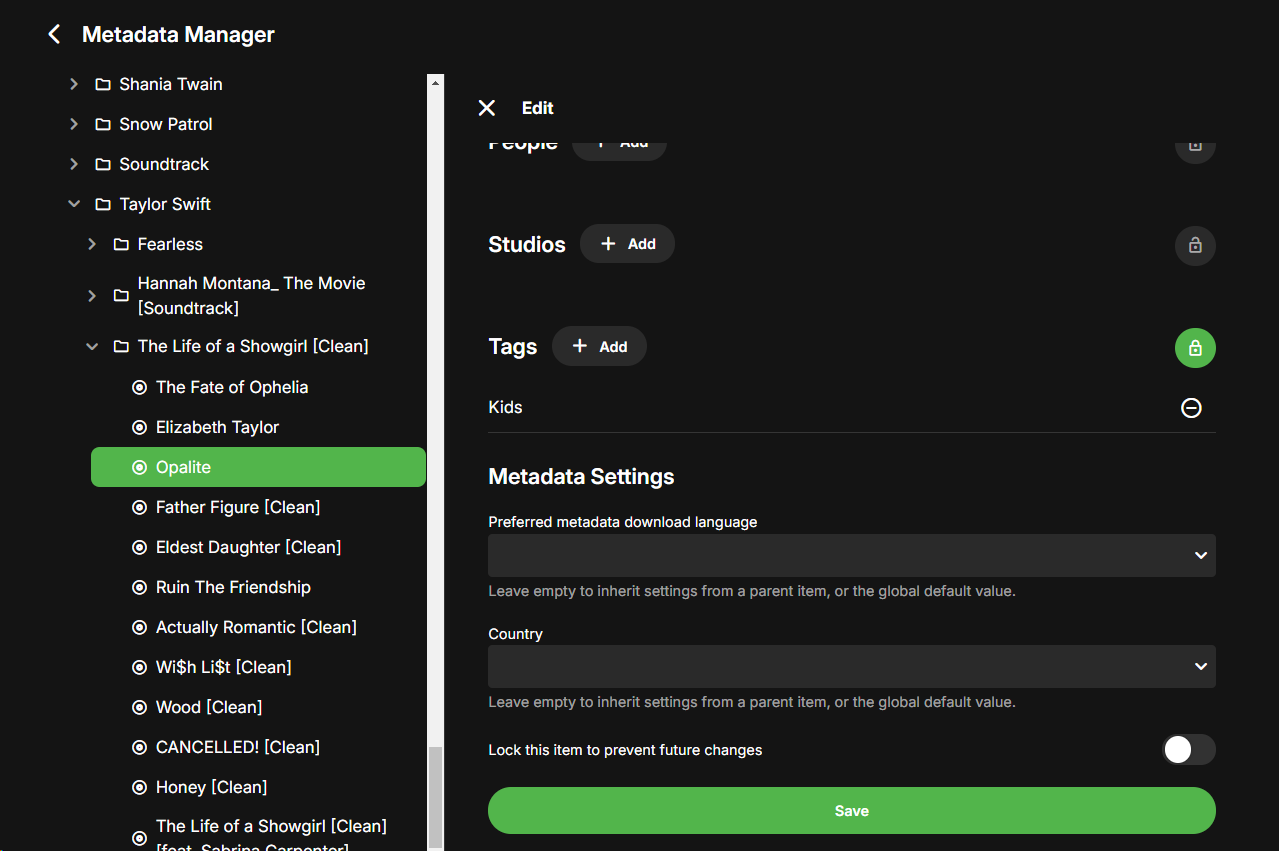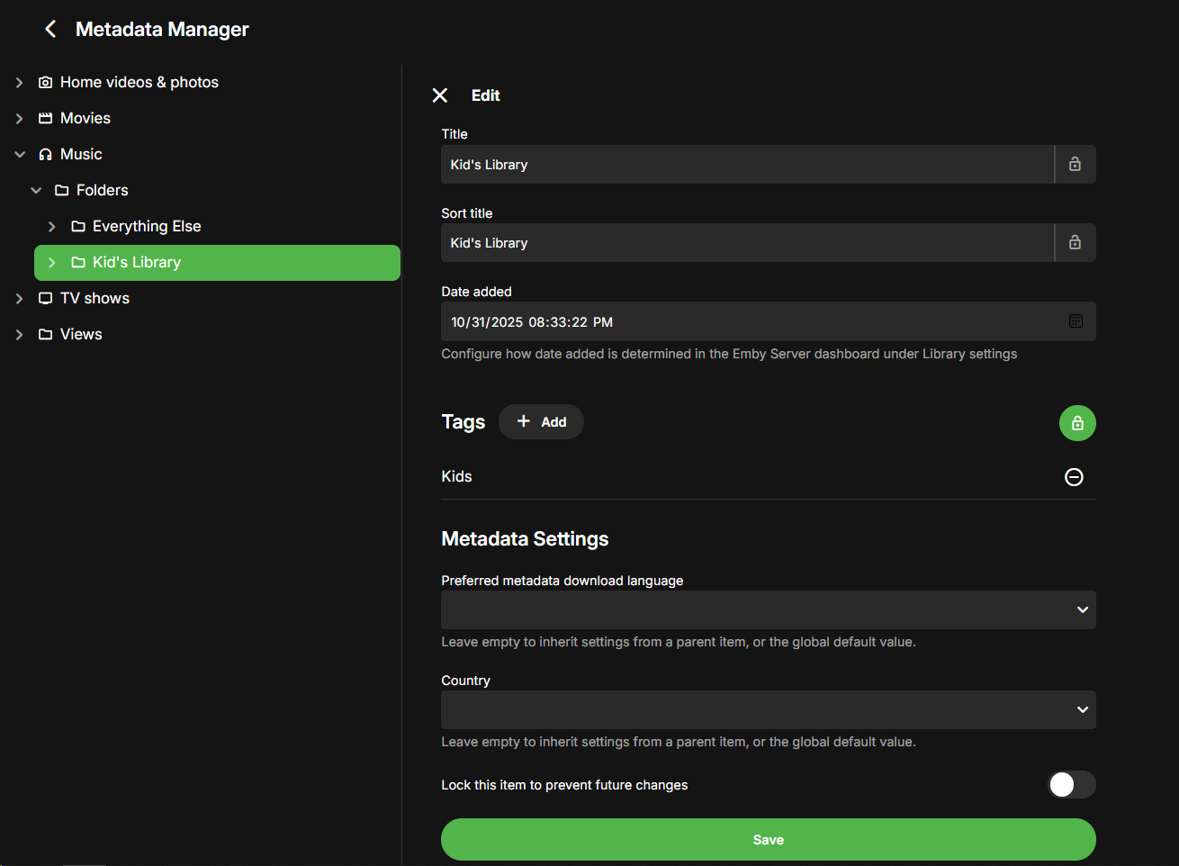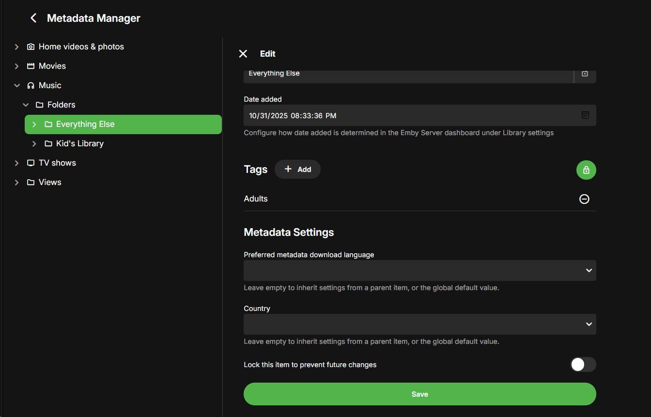 AustinStromness 0 Posted November 1, 2025 Posted November 1, 2025 I'm a new emby user, we're trying to set up a media server where we can better control what media my children have access to. (Maybe a few accidents with Alexa... dun dun dun) I'm having issues with specifically Music Albums not reflecting the tagging rules. I'm on server version 4.1.9.80 This seems to be a general affliction as I see the same behavior on the google tv app, ios app, fire app, and in the web browser. I have a 'Kids' Profile set to only allow content when tagged with 'Kids' My Music library is: Kids/Artist/Album/<songs> EverythingElse/Artist/Album/<songs> I've tagged the Kids directory with 'Kids I've also handpicked a few single songs from albums from the Everything Else directory so that they can be part of the Kid's library. The songs appropriately show up in the Music library for Kids in all the screens EXCEPT on the Albums screen. Parental Controls for Kids Profile Meta Data on Kid's Library Directory Single song tagged with Kids in the other directory: Albums not showing anyting But songs are present as expected <suggestions, album artists, artists, composers, genres, tags all appear appropriately if you want me to post screenshots I can but the above seems sufficient> I thought this was odd behavior. So I then decided to try the reverse approach. To have everything be allowed except the things that are tagged 'Adults'. Then I temporarily put the Adults tag on my everything else folder in the meta data. I then had the reverse problem where the kids profile could now see ALL albums even if the songs were not available due to tagging. parental controls on Kids "flipped" to restrict on tag 'Adults' Metadata tag on Everything Else folder: Songs appear the same: But now Albums show every album: And if the Kids profile selects an album that none of the songs should be available, the album appears to be empty: regular user it shows as a complete album: Based on these settings described it just seems Albums are not respecting tag values in parental controls (either through inheriting from a parent file directory) Or being set on the Album, Artist, or Song. Let me know if there's more information I can provide to you! Our current work around is to use the only allowed if tagged with Kids. then creating playlists for my kids to explore but having the albums page would make it easier for them to associate the pictures to the songs they've been listening to. embyserver.txt