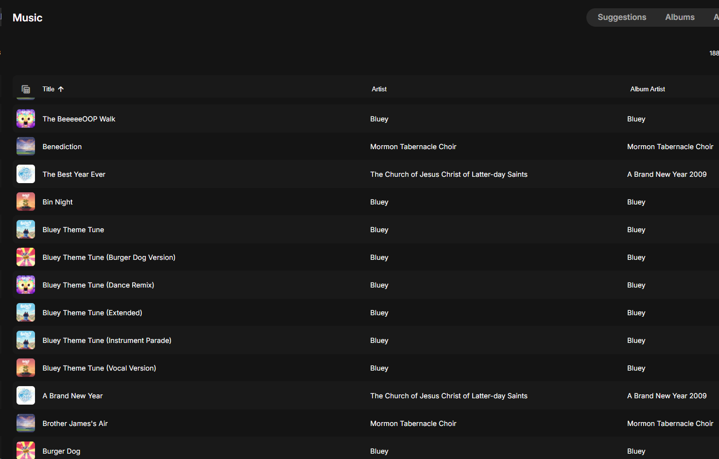 sa2000 674 Posted Tuesday at 10:22 AM Posted Tuesday at 10:22 AM On 14/02/2026 at 17:48, markle88 said: On the restricted user however, only 39 of those albums show up within the "album artist". Interestingly, some of the other albums that are missing from the "album artist" screen do show up in the "Latest Music" screen for the restricted user. But they do not show up under the "album artist". I have tried this out giving a user access to only 3 albums for an artist. I did my tests on the beta 4.10.0.3 and I can see an issue with the "Albums" view where they do not show but for the "Album Artists" tab, the artist shows and on clicking the artist I see the the 36 songs from the albums showing. I will refer the issue with the "Albums" tab to the development team but I do not see an issue with the "Album Artists" tab Maybe the missing albums went into "Various Artists" under "Album Artists" tab? please check that Would need actual examples and what emby server version in use and an emby server log covering the time when the albums are missing for the user - see How to Report a Problem