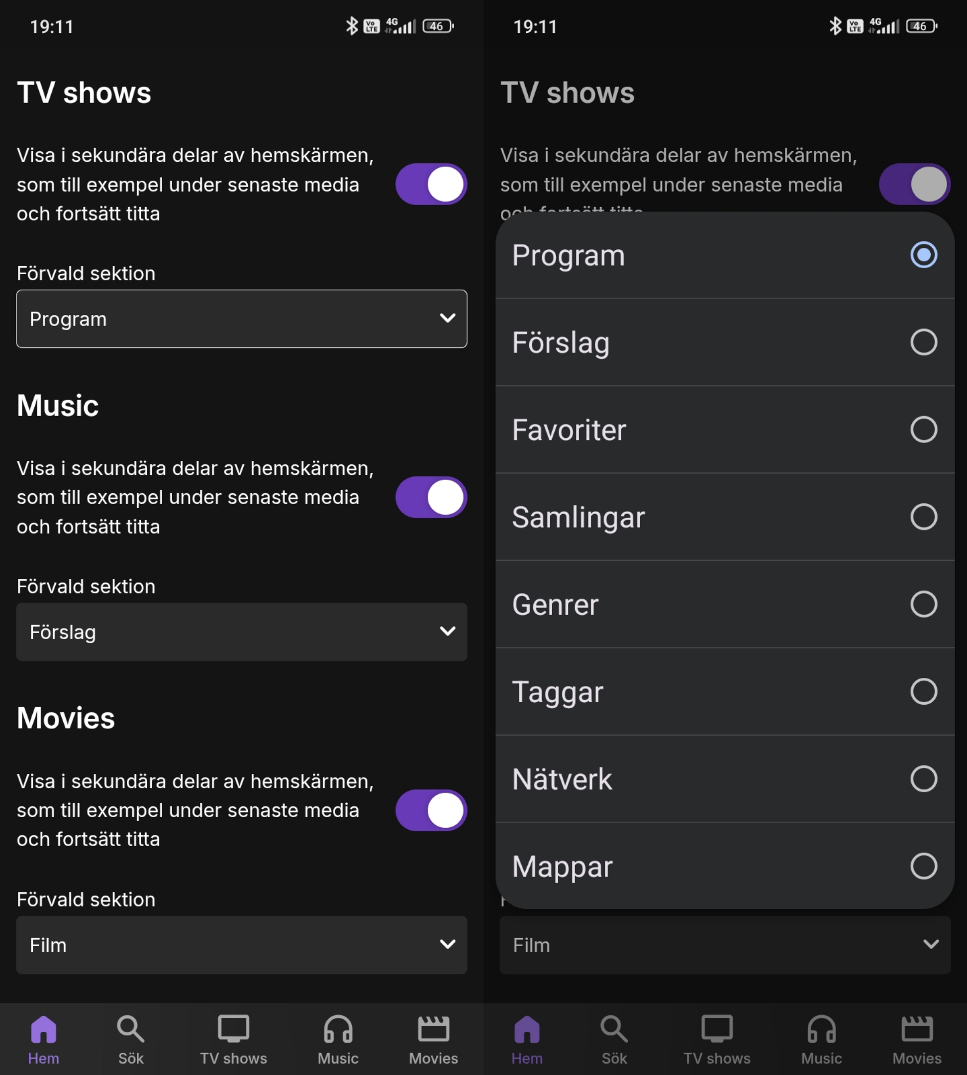 brothom 177 Posted November 11, 2025 Posted November 11, 2025 (edited) 1 hour ago, howllor said: You first go to the settings for the home screen (appinställningar -> hemskärm) and then you scroll down to the section after "biblioteksordning". There you can choose which view each library will start on when you go into it, under "förvald sektion". Each library can have its own setting. @howllorthese settings influence where the user is redirect by using the sidebar to go to a library directly. @RickyRialtois pointing out that using the "Latest X"-library link, routes the user to "Folder" view. I have the same issue with Anime and Documentary libraries (Mixed Content) that always redirect me to the "Folders": Clicking this leads to: Considering my nav links are slightly different, I'm assuming OP has a different library type. Edited November 11, 2025 by brothom