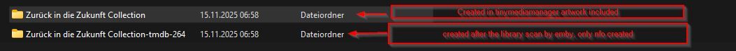 paddy75 16 Posted November 15, 2025 Author Posted November 15, 2025 hi luke, 1. created a collection for "back to the future" tinymediamanager created a folder "back to the future collection" in the metadata folder. Artwork is included here 2. after the library scan, emby created a second folder "back to the future collection-tmdb-264" (see attachment 1.jpg) 3. the first created folder with the artwork will not be scaned correctly by emby, because the artwork is not shown (see attachment 2.jpg + 3.jpg) 4. moved all artwork to the new folder "back to the future collection-tmdb-264" and scan the metadata folder, the artwork is shown. so why this behavior has changed in emby? It never created the collection folder follwoed by the tmdb-id. this would give also problems if you want to create your own collection which has no tmdb-id, because they will never be scaned.
