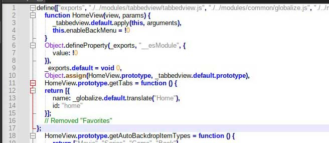 MediaEmby1968 47 Posted November 15, 2025 Author Posted November 15, 2025 Thanks, steps 1 and 3 worked for me, but I found the file for step 2, but I can't figure it out. I'm not very good with CSS or HTML, but I've tried editing things, but it's still not working. Could you help me? This is the code that appears, but I have no idea what to remove. define(["exports","./../modules/tabbedview/tabbedview.js","./../modules/common/globalize.js","./../modules/maintabsmanager.js","./../modules/emby-elements/emby-scroller/emby-scroller.js","./../modules/emby-elements/emby-button/emby-button.js"],function(_exports,_tabbedview,_globalize,_maintabsmanager,_embyScroller,_embyButton){function HomeView(view,params){_tabbedview.default.apply(this,arguments),this.enableBackMenu=!0}Object.defineProperty(_exports,"__esModule",{value:!0}),_exports.default=void 0,Object.assign(HomeView.prototype,_tabbedview.default.prototype),HomeView.prototype.getTabs=function(){return[{name:_globalize.default.translate("Home"),id:"home"},{name:_globalize.default.translate("Favorites"),id:"favorites"}]},HomeView.prototype.getAutoBackdropItemTypes=function(){return["Movie","Series","Game","Book"]},HomeView.prototype.setTitle=function(){},HomeView.prototype.onPause=function(){_tabbedview.default.prototype.onPause.call(this)},HomeView.prototype.destroy=function( ){_tabbedview.default.prototype.destroy.apply(this,arguments)},HomeView.prototype.loadTabController=function(id){switch(id){case"home":return Emby.importModule("./home/hometab.js");case"favorites":return Emby.importModule("./home/favorites.js");default:throw new Error("tab not found: "+id)}},HomeView.prototype.onWindowInputCommand=function(e){"home"===e.detail.command?(_maintabsmanager.default.selectedTabIndex(0),e.preventDefault()):_tabbedview.default.prototype.onWindowInputCommand.apply(this,arguments)};_exports.default=HomeView});