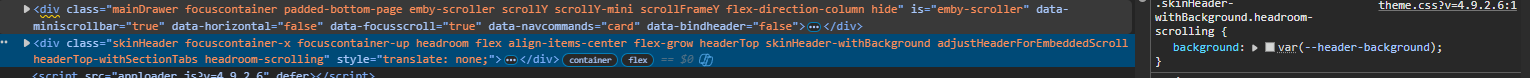 Solution Happy2Play 9780 Posted November 15, 2025 Solution Posted November 15, 2025 (edited) 8 hours ago, MediaEmby1968 said: 1. Make this background that appears at the top of the screen when you scroll down from the home screen slightly transparent. something like this div.skinHeader-withBackground.headroom-scrolling {background: hsla(150, 2.44%, 83.92%, 90%);} Note this applies everywhere. 8 hours ago, MediaEmby1968 said: 2. Remove this text (I've read here that it can't be done with CSS, that you have to edit a file; does anyone know which file and what to edit in it?) Correct as the skinheader is not tied to a page so scripts load the tabs per page. As custom css would remove the tabs from everywhere. But I believe you have to look at the \system\dashboard-ui\home\home.js. 8 hours ago, MediaEmby1968 said: 3. Remove this text or image Not really discussed. https://emby.media/community/index.php?/topic/90404-remove-get-emby-premiere-button/#findComment-930529 Edited November 15, 2025 by Happy2Play