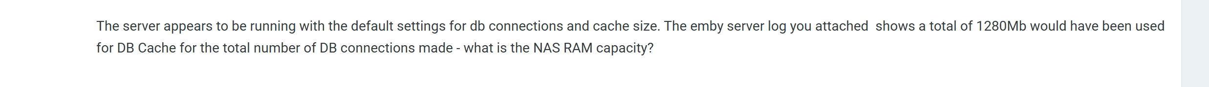 Kiniu 22 Posted November 21, 2025 Author Posted November 21, 2025 1 hour ago, sa2000 said: @KiniuTo see if it is to do with scanning media libraries, could you do the following: - enable debug logging on emby server - see Log Files article - in an ssh session to the NAS (using puTTY for example) run the following script: (echo "PID,time,VmPeak,VmSize,VmLck,VmPin,VmHWM,VmRSS,VmData,VmStk,VmExe,VmLib,VmPTE,VmSwap"; while :; do PID=$(pidof EmbyServer | awk '{print $1}'); [ -z "$PID" ] && { sleep 1; continue; }; printf "%s," "$PID"; date "+%F %T" | tr '\n' ','; awk '/^VmPeak|^VmSize|^VmLck|^VmPin|^VmHWM|^VmRSS|^VmData|^VmStk|^VmExe|^VmLib|^VmPTE|^VmSwap/ {gsub(/ kB/, "", $2); gsub(/[ \t]/, "", $2); printf "%s,", $2}' /proc/$PID/status | sed 's/,$//'; echo; sleep 1; done) | tee "$(cat /etc/hostname)_emby_memory_log_$(date +%F).csv" This will log memory use second by second to the screen and also to a file in the current directory for the ssh session into a file named: "<server-name>_emby_memory_log_<date>.csv" Leave this running Then restart Emby Server to get fresh logs and also to capture memory use from start When the problem arises with the emby server process stopped capture the syslog and emby server log (if going overmidnigh, include all logs covering period) and the csv file created by the script The server appears to be running with the default settings for db connections and cache size. The emby server log you attached shows a total of 1280Mb would have been used for DB Cache for the total number of DB connections made - what is the NAS RAM capacity? Hi sa2000. myram capcity is 8gb. is there any chance you can send me a tutorial or something how to navigate in command line? im really new to this but really whats to try.:) 1
