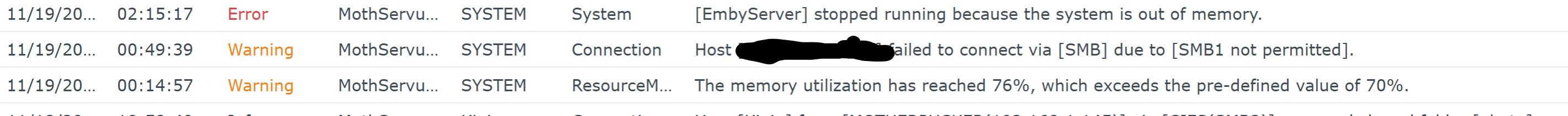sa2000 674 Posted December 3, 2025 Posted December 3, 2025 2 hours ago, Kiniu said: I have all the files that you need eventually prepared for you I need all the embyserver log files downloaded and attached You have given me the embyserver file for 45 seconds period from 3 December 13:18:08 to 13:18:46 I need all the embyserver-xxxxx.txt files for the following period: 1 December 12:11 (time of launch of emby server) up to 3 December 13:15 (when it crashed) By the way your memory logging got interrupted at 10:45 on 2 December and i have a gap up to 12:36 2 December. But at that time - although it did not crash memory use was at similar level close to 5.5 Gb. So just download all the other embyserver logs before they get purged. They get purged after 3 days