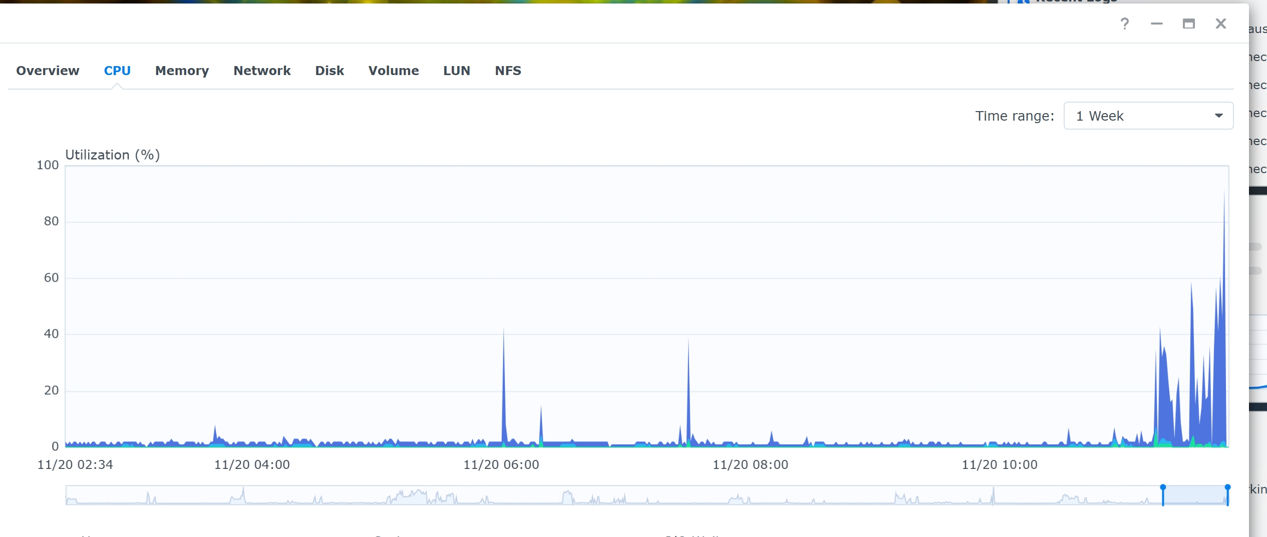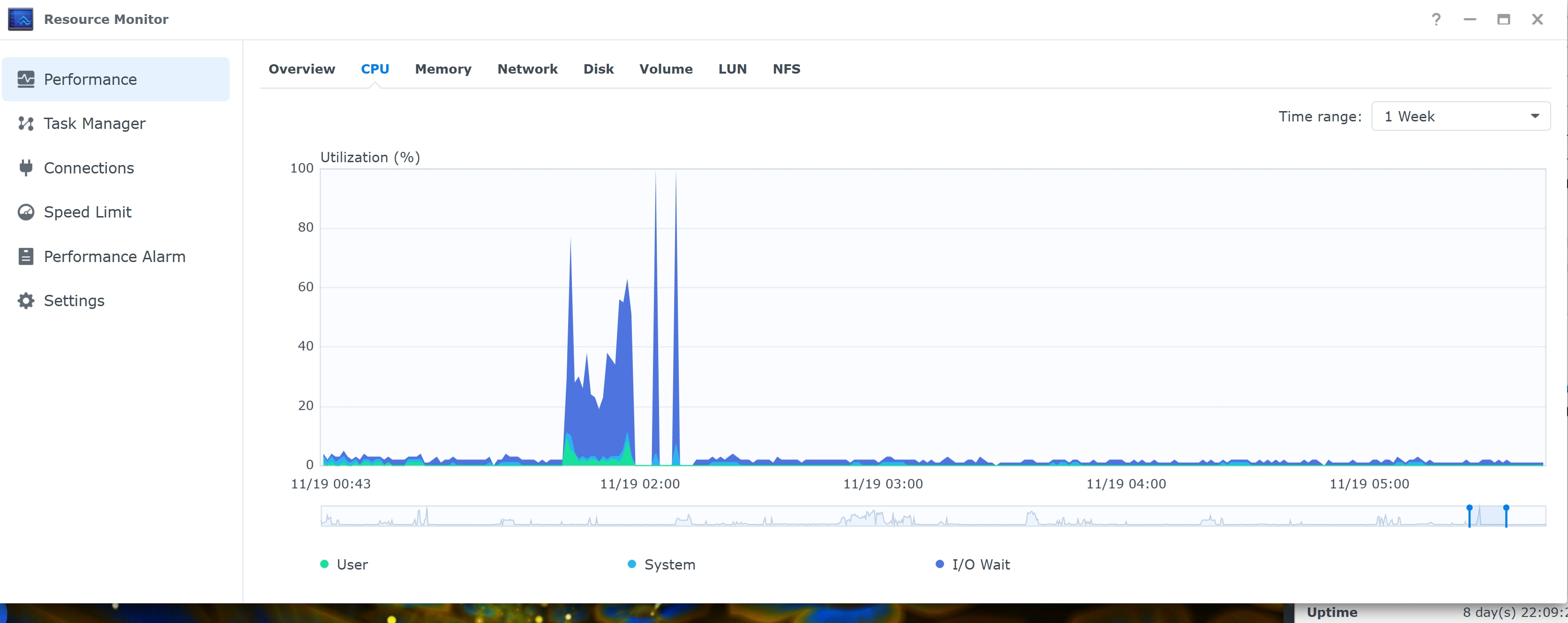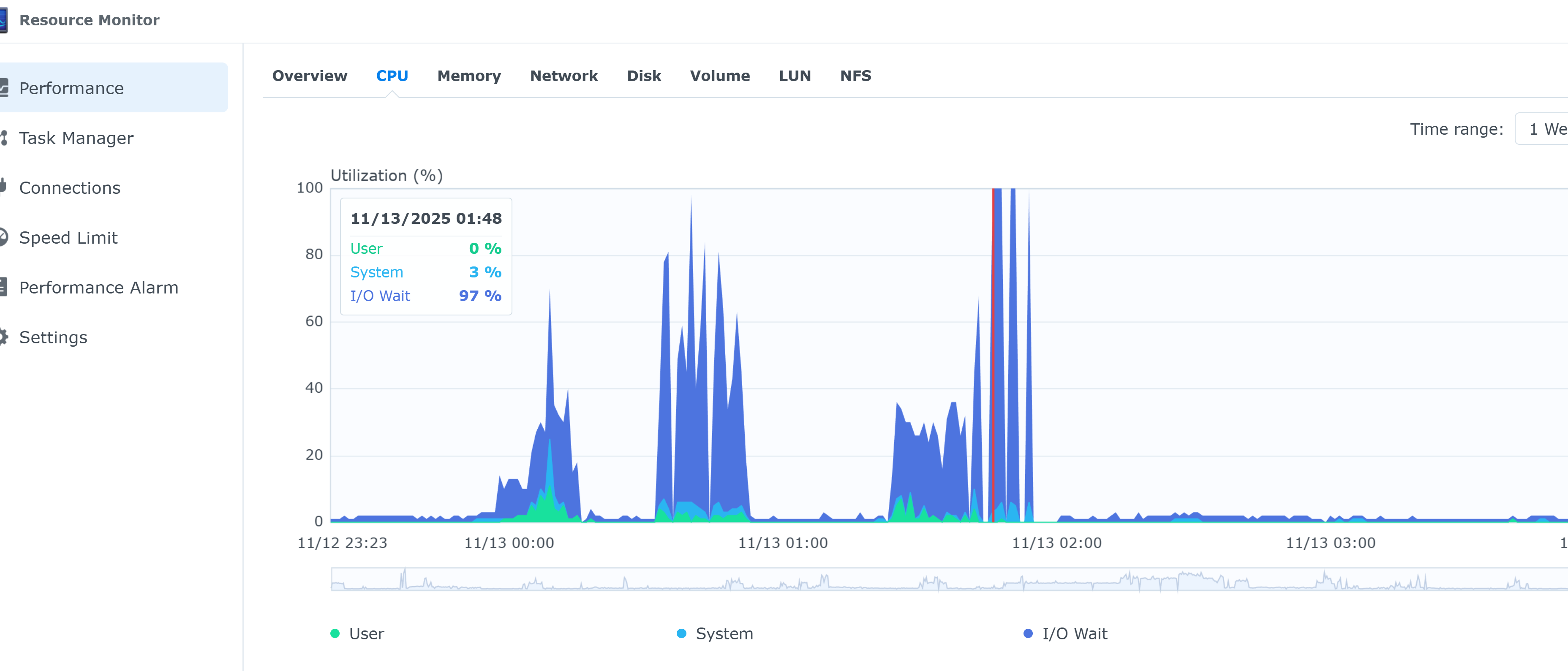 Kiniu 22 Posted November 17, 2025 Posted November 17, 2025 Hello there. Unfirtunately problem not solved.... i thiught that when i buy more RAM everything is going to be ok but it isnt, it happened again. i did a little research myself but im not a brainiac like you guys so i use common sense i try to find anything out of the ordinary and this is what i found: when i looked at memory i found nothing, network also in normal state but CPU was alarming: i/o wait cause emby to crash. as far as read about his it is cause by applicatio it self but that all i could understan maybe someone have an idea how to fix this? i want to also add that it happend when server was idle in the middel of the night - everytime, i attach logs as well. embyserver.txt