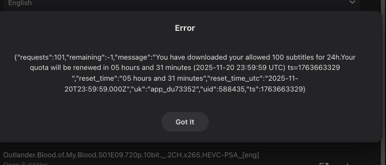 sundevil67 28 Posted November 20, 2025 Posted November 20, 2025 I've had the Open Subtitles Plugin installed for a very long time, and have had the automatic download option enabled for libraries with thousands of titles before ... and it happened on a day without anything going on in terms of scheduled tasks, and I'm just wondering if there is a way to investigate the when/where/why/how of this .. I can't see anything in the logs related to it. but this is the first time I've ever seen this error pop up. Has this happened to anyone else?