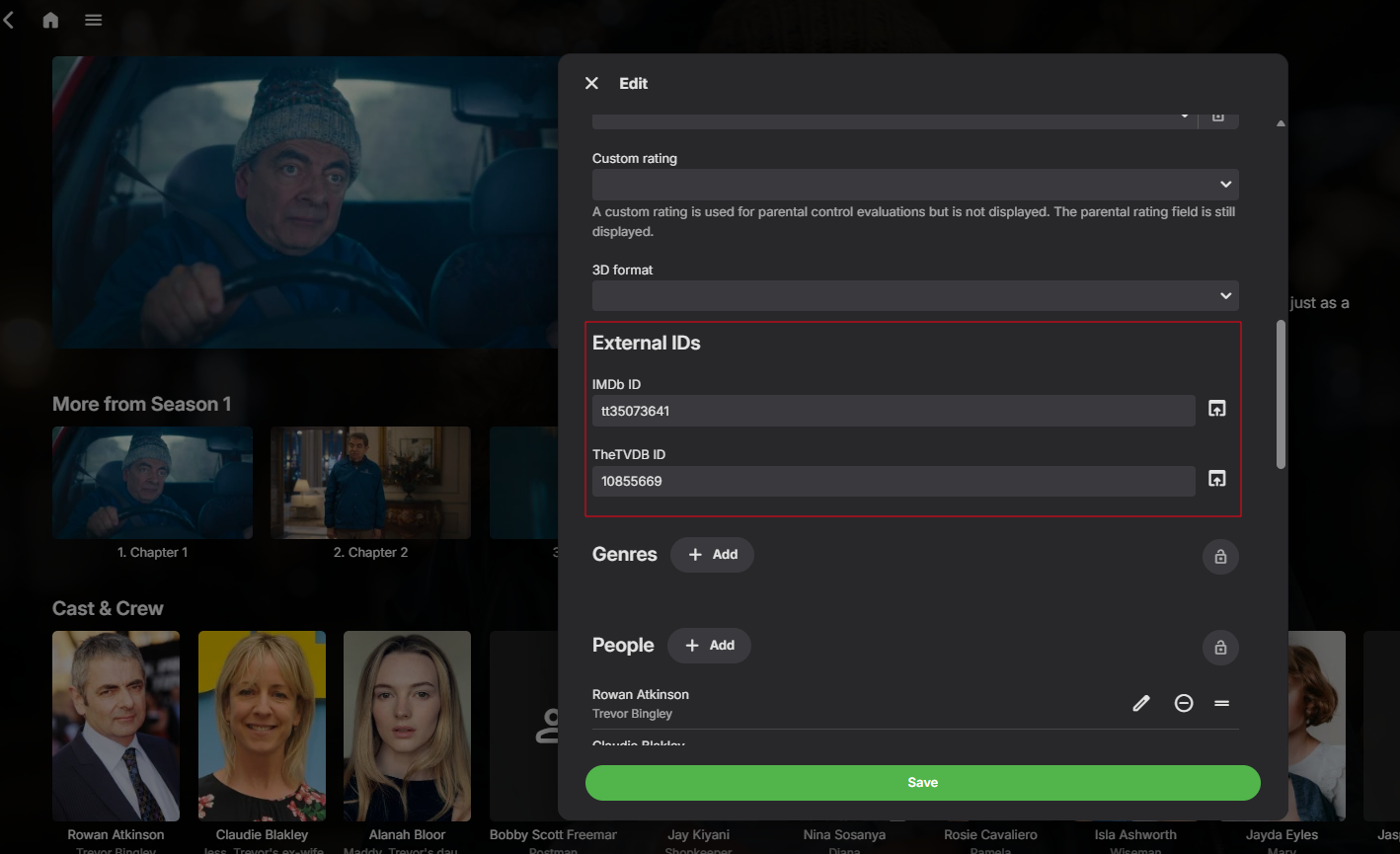 yocker 1247 Posted December 18, 2025 Author Posted December 18, 2025 (edited) 2 hours ago, Neminem said: Hmm just wondering if tmdb id is the right one to use. Looking at episode level metadata I don't see tmdb id. It might be me misunderstanding this No, but the TVDB is there which is what i absolutely, 100% sure and of cause meant. Good catch! Edited December 18, 2025 by yocker 1