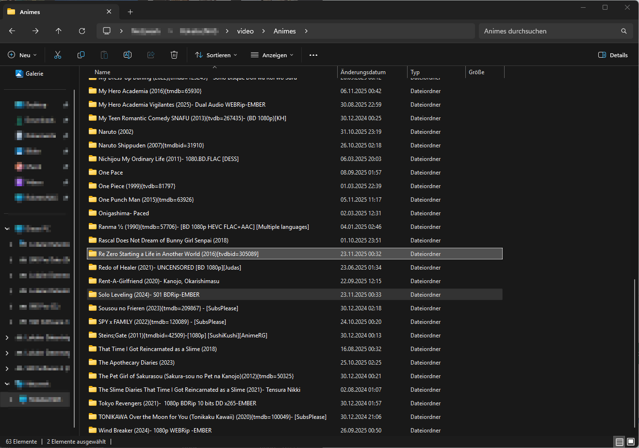 RokeWayne 5 Posted November 23, 2025 Author Posted November 23, 2025 (edited) 32 minutes ago, GrimReaper said: For Solo Leveling you're not seeing it as it's a season folder (S01) - Each TV show needs to have its own folder, season folders are not supported. Well, it "was" identified correctly in earlier emby versions, because the S01 was behind a hyphen ( - ). Normally I'm able to put some additional information behind a Hyphen, typically some season related stuff. But I tested anyway with your remark in mind, but it didn't help - It would have baffled me, since other series folders are well identified as long as a "S1" or "Season 1" is behind a hyphen. Thats how it looks on storage now, but no improvement in the folders view of emby after two rescans (one specific library scan and one global scan): 32 minutes ago, GrimReaper said: TV Naming Etiher rename that folder (dumping "S01") or create series finder and movie it within. As for ReZero, that one appears correctly named, without server log in gs hard to tell what's happening. You could try: 1) Move ReZero folder out of your Anime root 2) Scan media library 3) Run Rotate log file scheduled task 4) Delete existing NFO files from ReZero folder (if any) 5) Move it back under Anime folder 6) Scan media library 7) Post server log I'll try it when I wake up later. Here it's 2.20 am. Thanks for your support and I will come back to you. Kind regards Roke Edited November 23, 2025 by RokeWayne