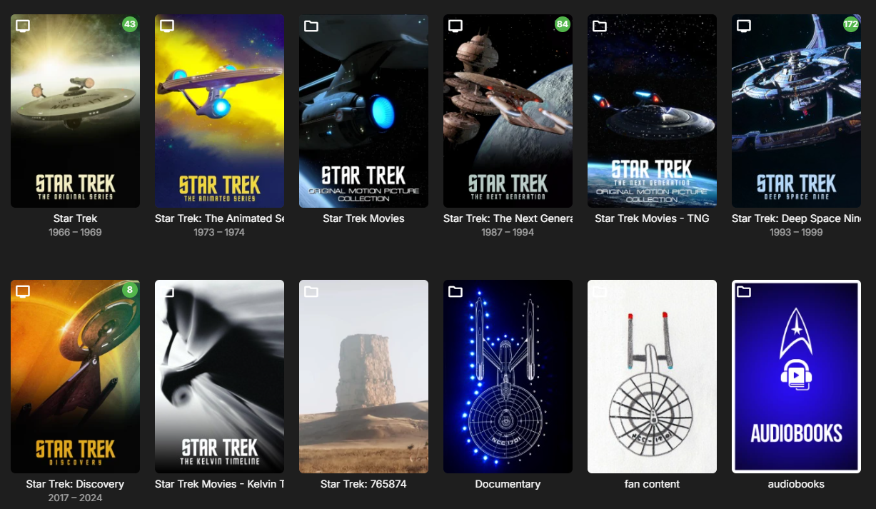 mrmixed 77 Posted December 24, 2025 Posted December 24, 2025 On 12/22/2025 at 6:42 AM, IAmHugh said: I for one like having the TV Series library, Movies Library, Movie Series library, etc..., but I would not mind having a way to say under Collections to have the original movie series in one folder, rebooted movies in a separate folder, and both folders in the parent folder. So say Star Trek Series click on it's collection poster and be presented with sub collections for the original series of movies and one for the reboot collection. For what it's worth, this is what you can do with a Mixed Content library and Folder View (and my apologies if I'm inadvertently reposting anyone's copyrighted images that I borrowed for the folder art). And there is really no configuration needed, other than adjusting the Sort Titles and choosing images for the main folders. (Although I do agree with @Raelonethat the old version always used to autogenerate images for folders. I don't think I have ever encountered a situation in the previous version where a folder image was simply left blank.) 1