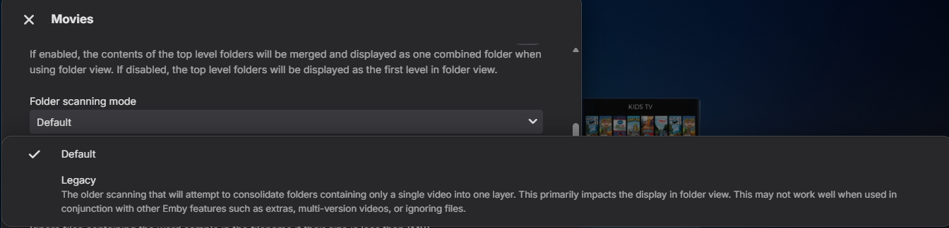 Zelig 48 Posted December 18, 2025 Author Posted December 18, 2025 Let's see if I can bring some light to this: I'm actually in 4.9 Have some "movie type" libraries created long long ago. "Folder view" for this libraries still function same as in 4.8 However If i create a new "movie" type library in 4.9 It will perform with the new "folder view" and not the 4.8 type folder view. So yes, the new option for legacy view should be avaliable for "Mixed" and "Movie" folder types to get the full 4.8 "Folder view". 1